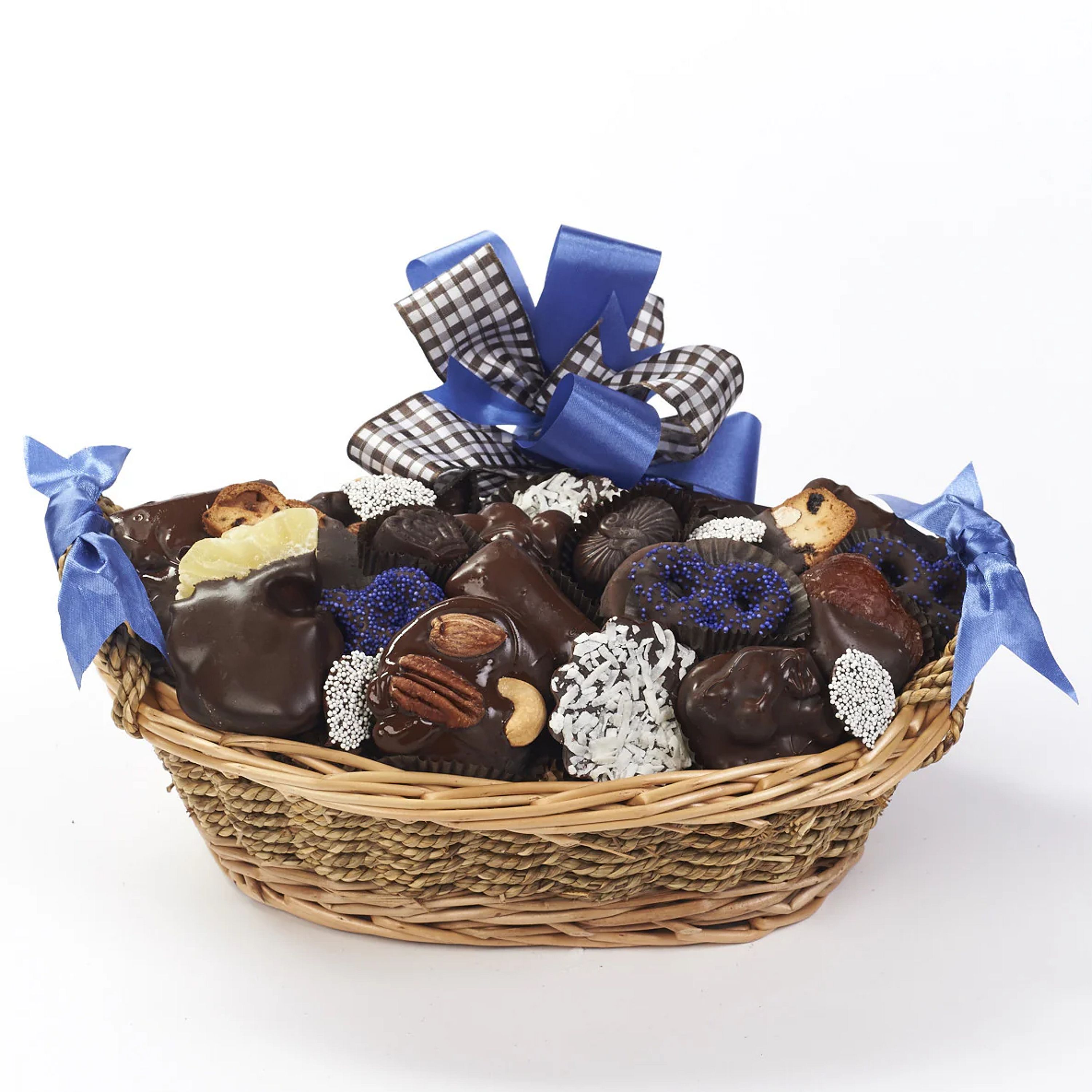 Enjoy a wonderful assortment of Krön parve chocolate for your next family gathering! Includes many Krön premium chocolates including caramel and nut turtles, almond bark, chocolate truffles, coconut patties, nonpareils and more. 1.75 selection, cello-wrapped wicker gift basket.