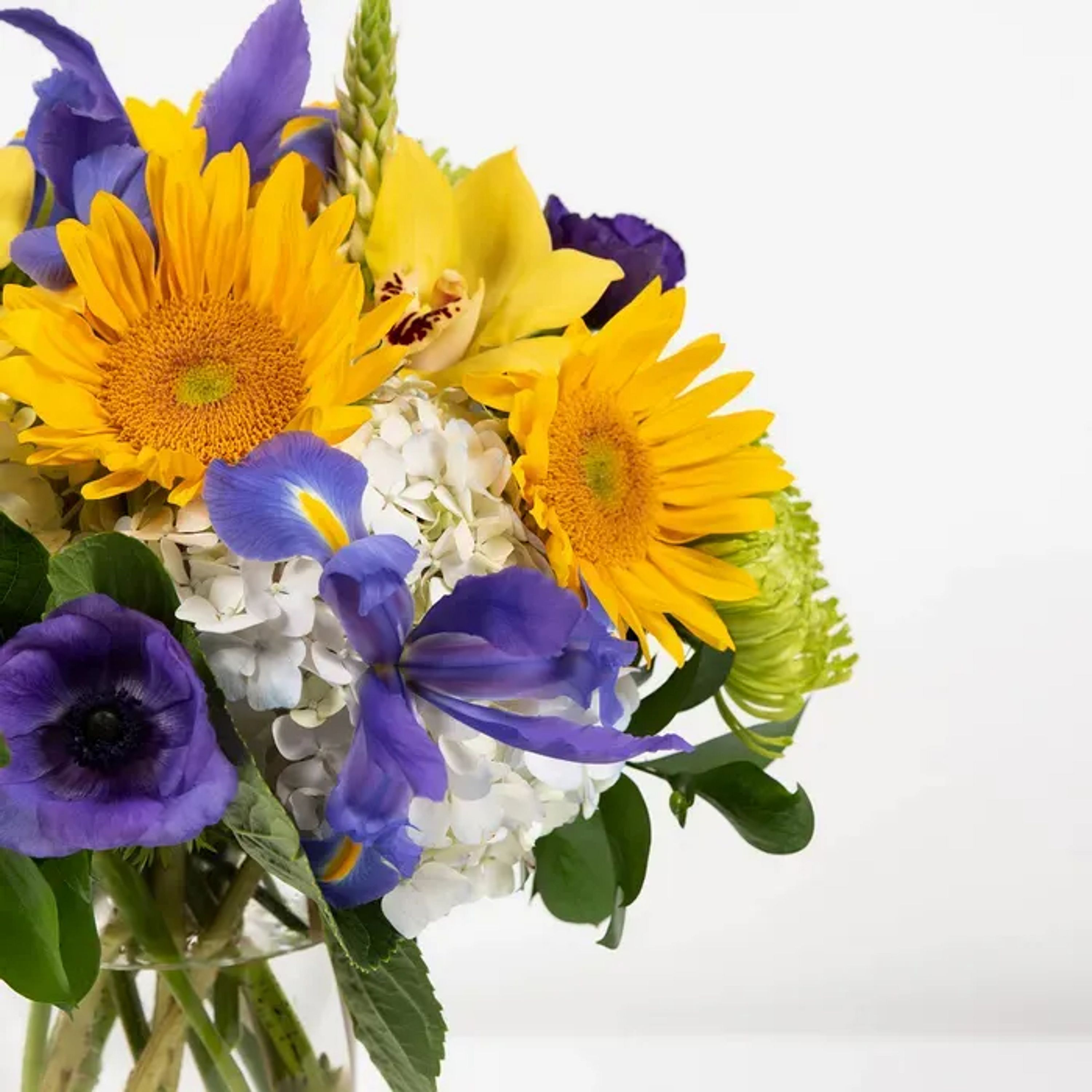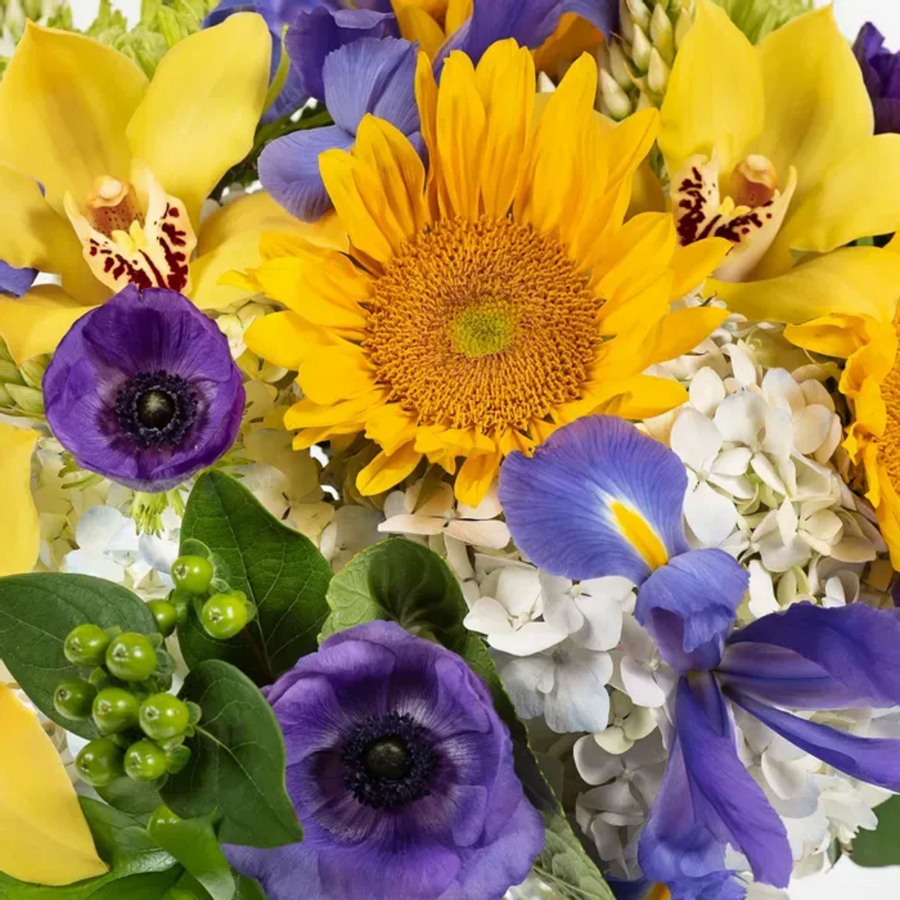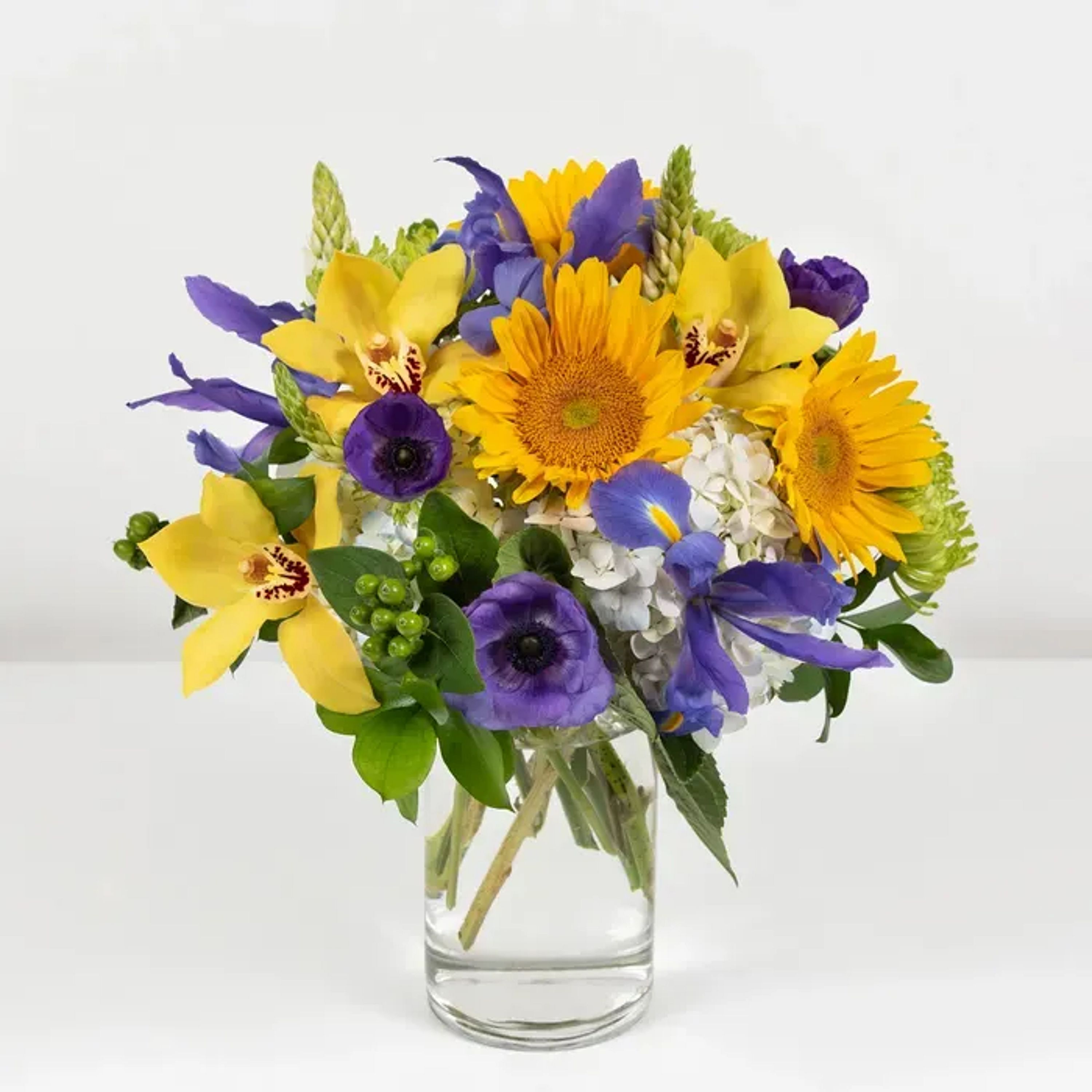 Hydrangeas, mini sunflowers, orchids, and iris combine to form this regal arrangement.