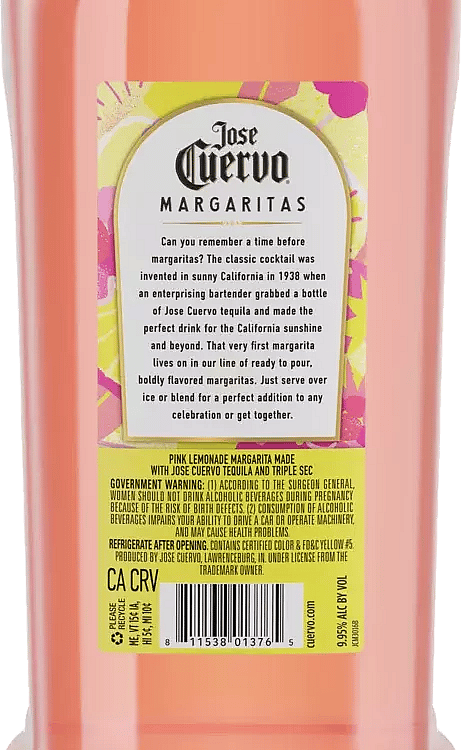 Cuervo ready-to-serve margaritas come in many classic, fruity and fun flavors made exclusively with Jose Cuervo® tequila. Jose Cuervo® Authentic Margaritas offer the convenience of a one-step margarita with plenty of ways to enjoy it: • Pour over Ice • Blend • Make it a spritz/add sparkling water • Garnish with a lemon slice or pink dragon fruit • Sugar rim recommended!