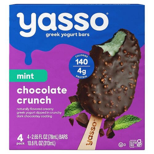 A 4‑pack of Yasso frozen Greek yogurt bars with refreshing mint‑flavored Greek yogurt coated in a rich, crunchy chocolatey shell sprinkled with crisp quinoa pieces. Each bar delivers cool minty flavor with creamy texture and satisfying crunch, making it a refreshing and lighter alternative to traditional ice cream desserts. These bars are naturally flavored, provide protein per serving, and are perfect straight from the freezer for a tasty treat.
