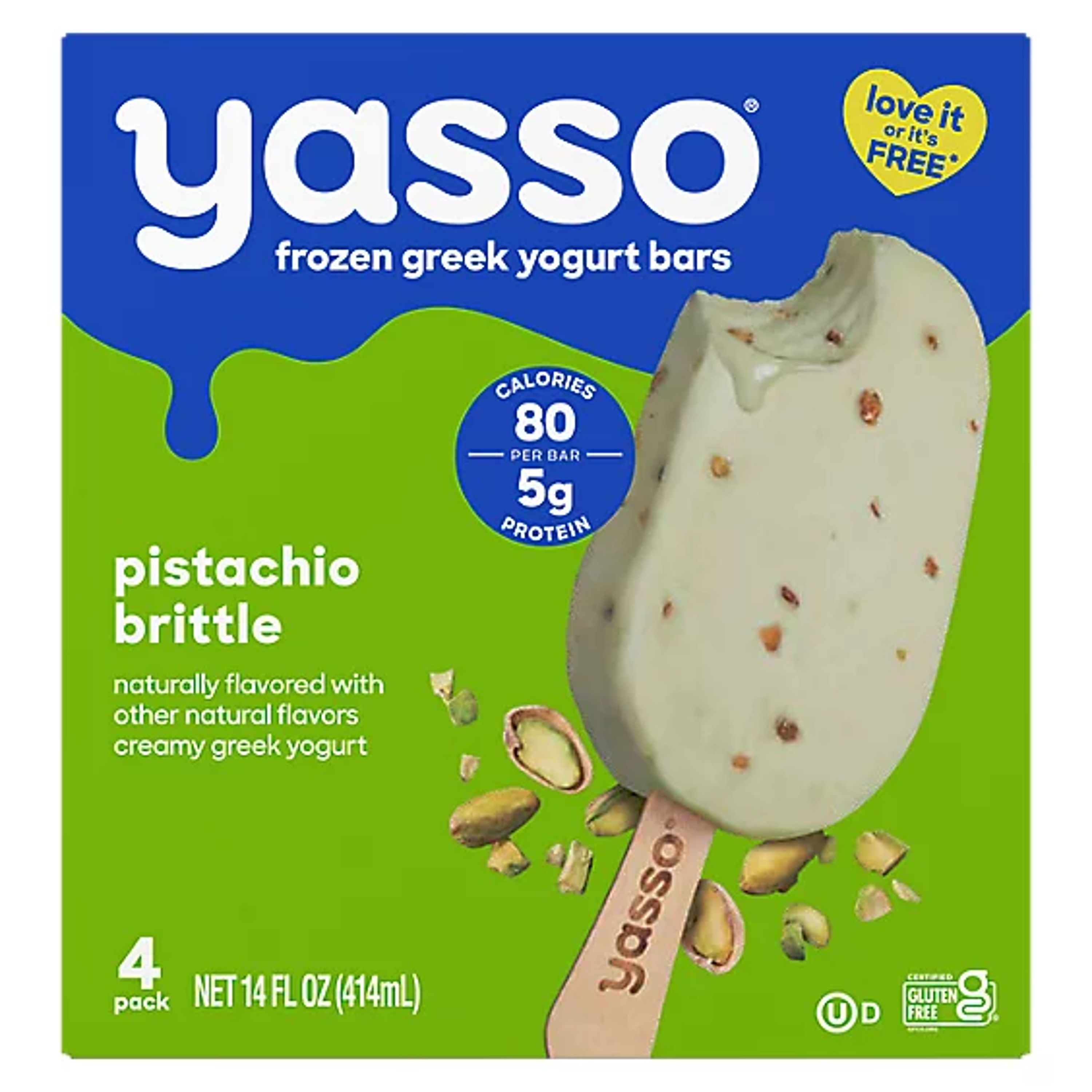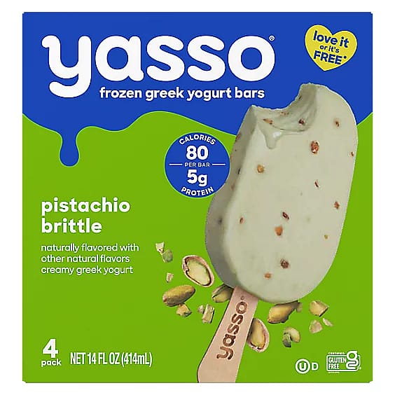 A 4‑pack of frozen Greek yogurt bars featuring creamy pistachio‑flavored Greek yogurt blended with crunchy pistachio brittle pieces. Each bar has a nutty flavor and smooth texture, offering about 80 calories and 5 g of protein per serving. Made with quality ingredients and no artificial additives, these gluten‑free bars deliver a refreshing, lighter alternative to traditional ice cream treats straight from the freezer.