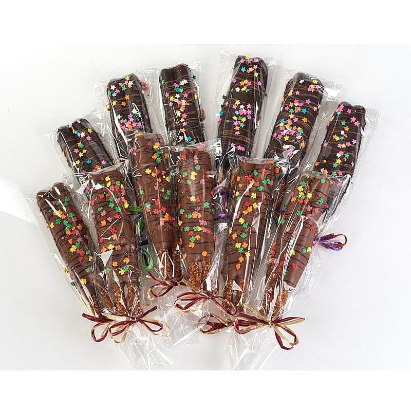 Our double-dipped chocolate covered pretzel rods, are available in smooth milk or rich dark chocolate and decorated with candy sprinkles. Each cello bag contains a 7" double-pretzel wrapped and tied with ribbon. Colorful, fun and quite delicious, our double-dipped pretzel rods make great treats for birthday parties, baby showers and holiday celebrations.