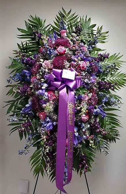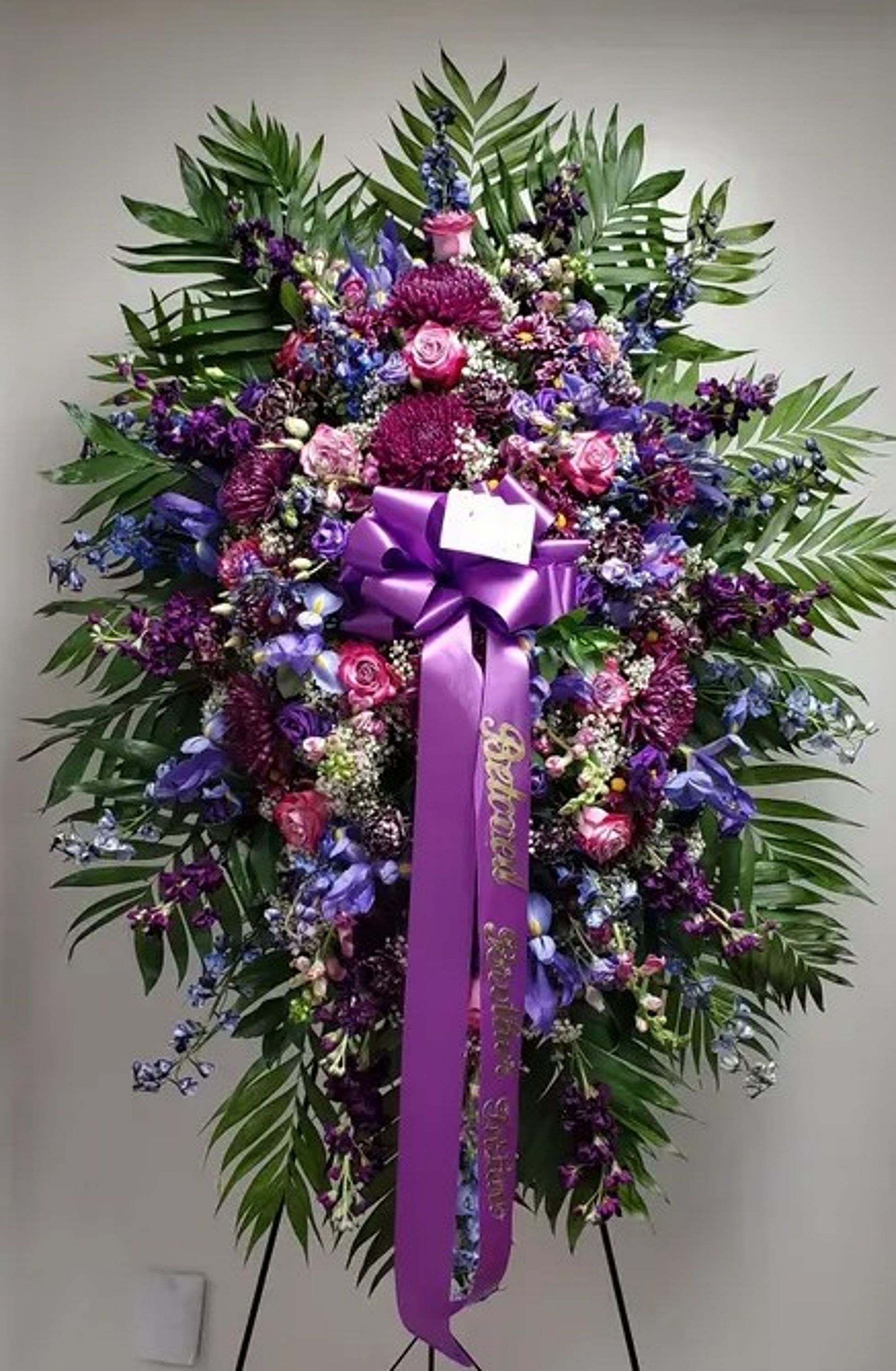 Lush purples and blues in standing spray. Perfect to convey your sympathies.