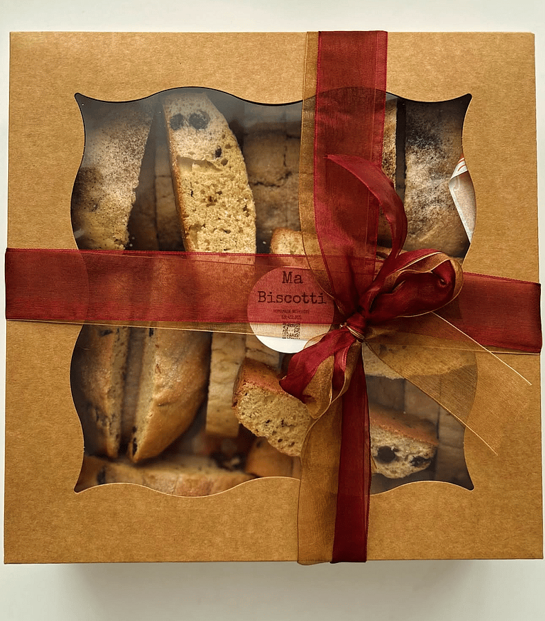 A box of 20 soft biscotti with a choice of two flavors Perfect for parties, office treats, gifting, or for your indulgence at home. Baked fresh and to order all in a beautiful arranged box.