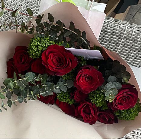 Two dozen classic roses tied in a classic bouquet. Roses are mixed with greens and assorted filler flowers.