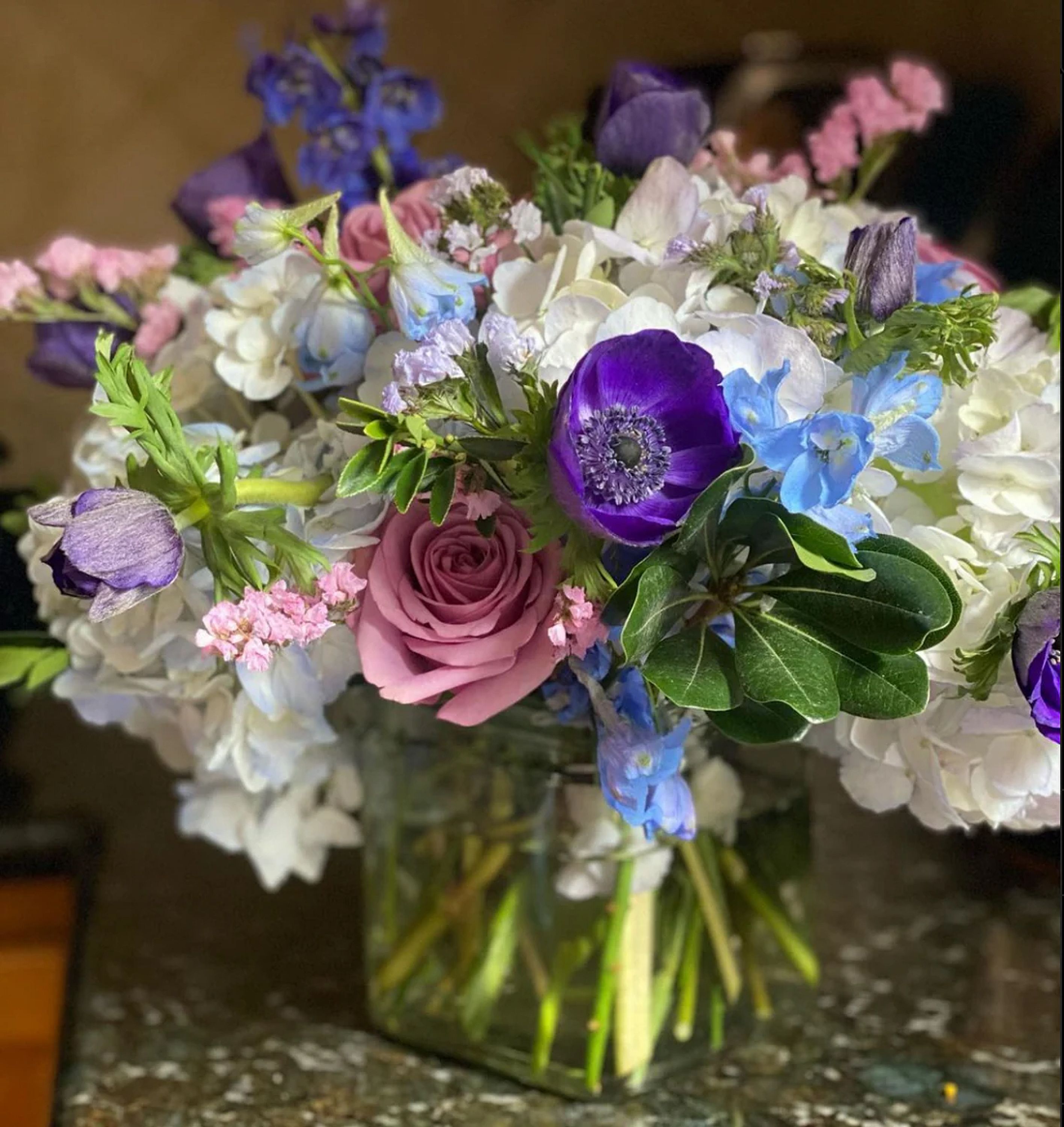 Lovely layers of blue, purple, pink & white all wrapped up in a vase arrangement. Olive It... is conveniently located in Merrick, NY and offer delivery throughout New York.