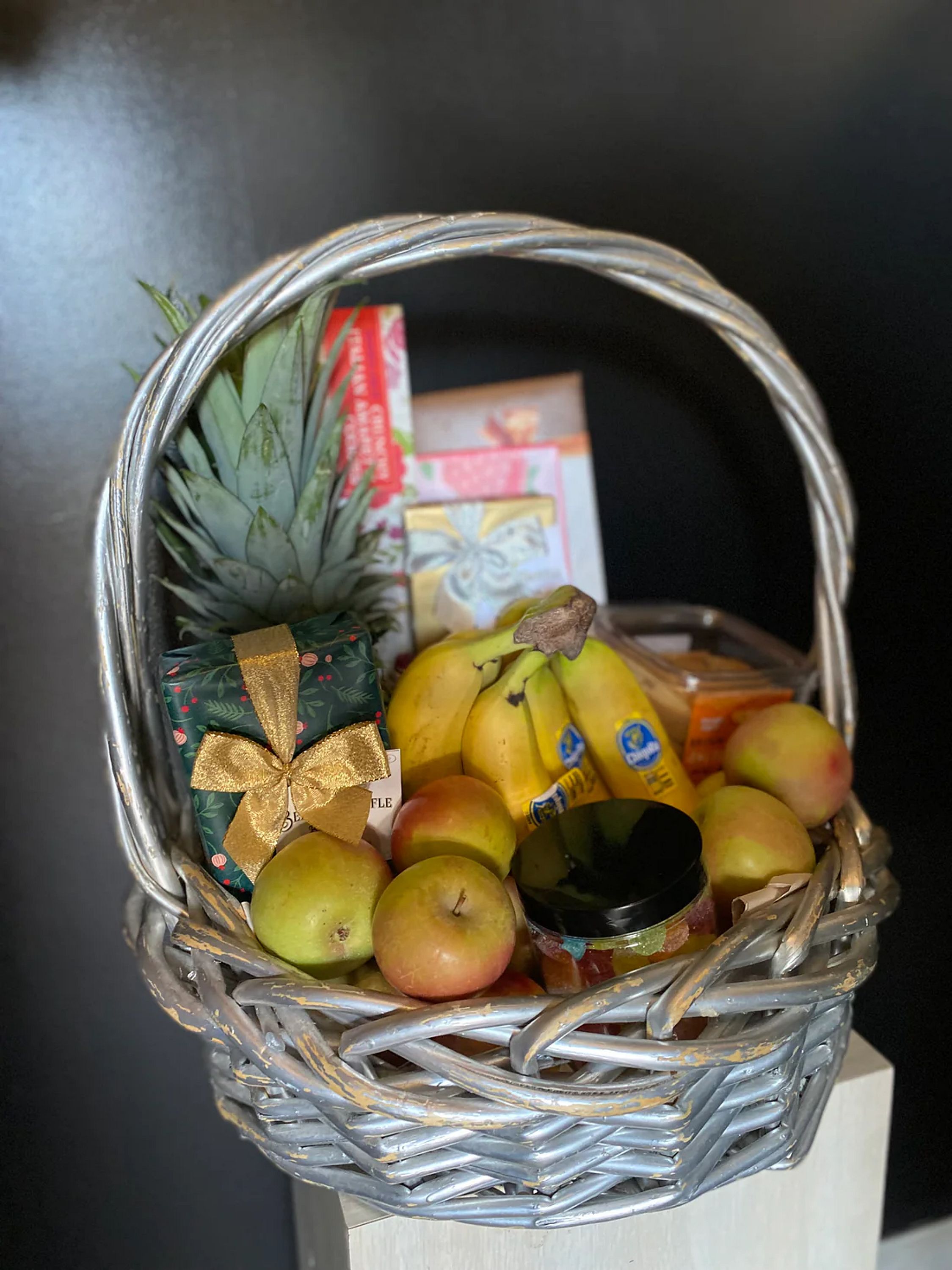 All your favorites wrapped up in a basket. Each basket comes with assorted fruits and gourmet snacks.