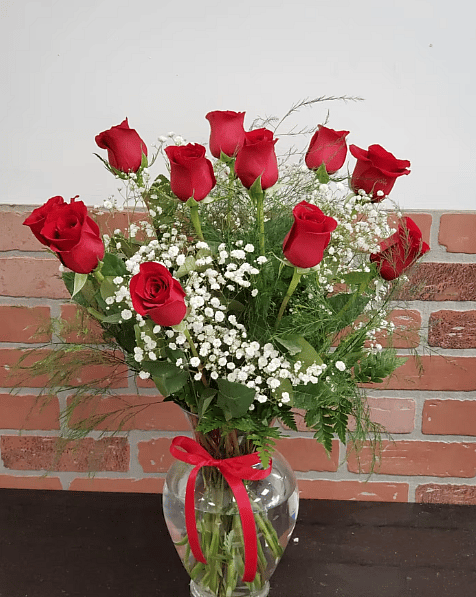 Dozen Red Rose's in a vase with baby breath - Standard