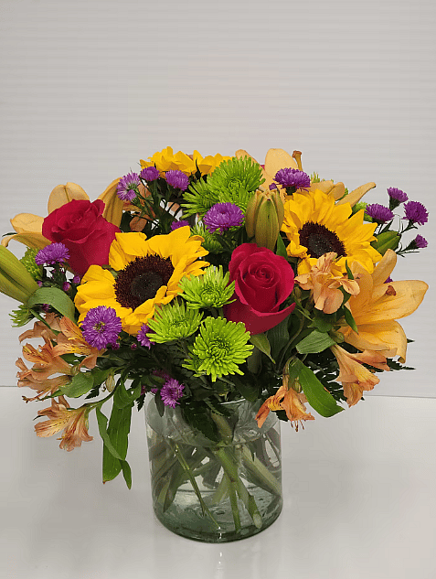 Bright Embrace is in nice, low cylinder vase with Bright color flowers for any occasion.