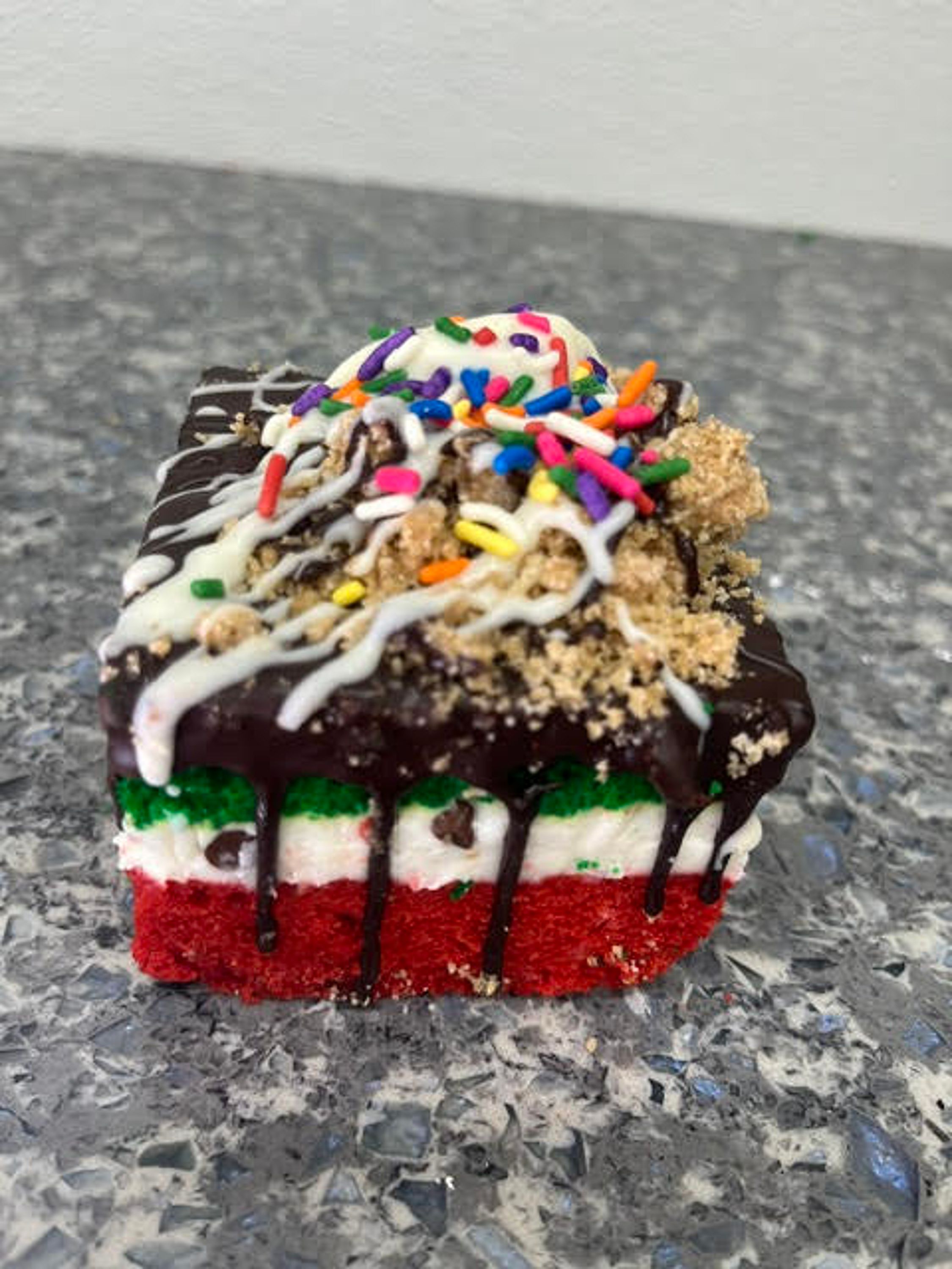 Rainbow cookie stuffed brownie with chocolate fudge large size