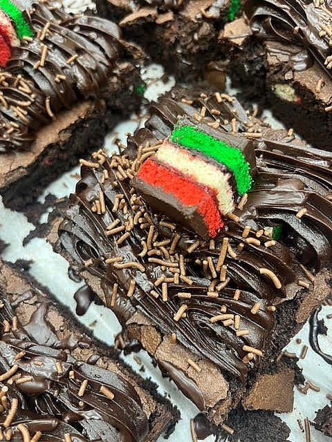 Rainbow cookie stuffed brownie with chocolate fudge large size