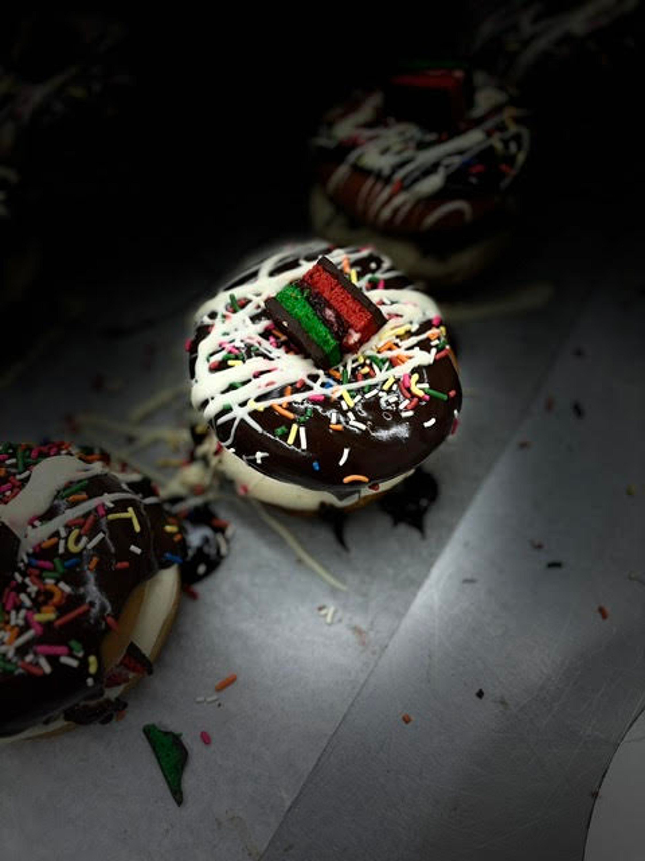 Rainbow cookie stuffed brownie with chocolate fudge large size