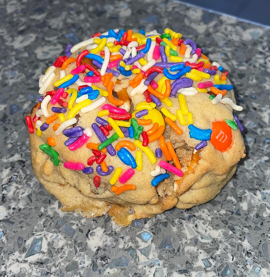 The Joe Joe cookie , a mix of marshmallows , pretzels , sprinkles , m and ms , chips ahoy , and Oreos 1 cookie large cookie