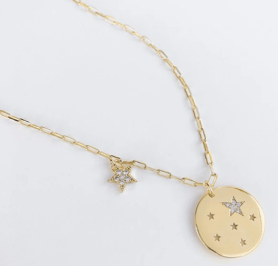 Gold Plated tiny paperclip chain necklace with a pave cubic zirconia cz medallion & five star cutouts. 8K gold plated over brass, cubic zirconia.
