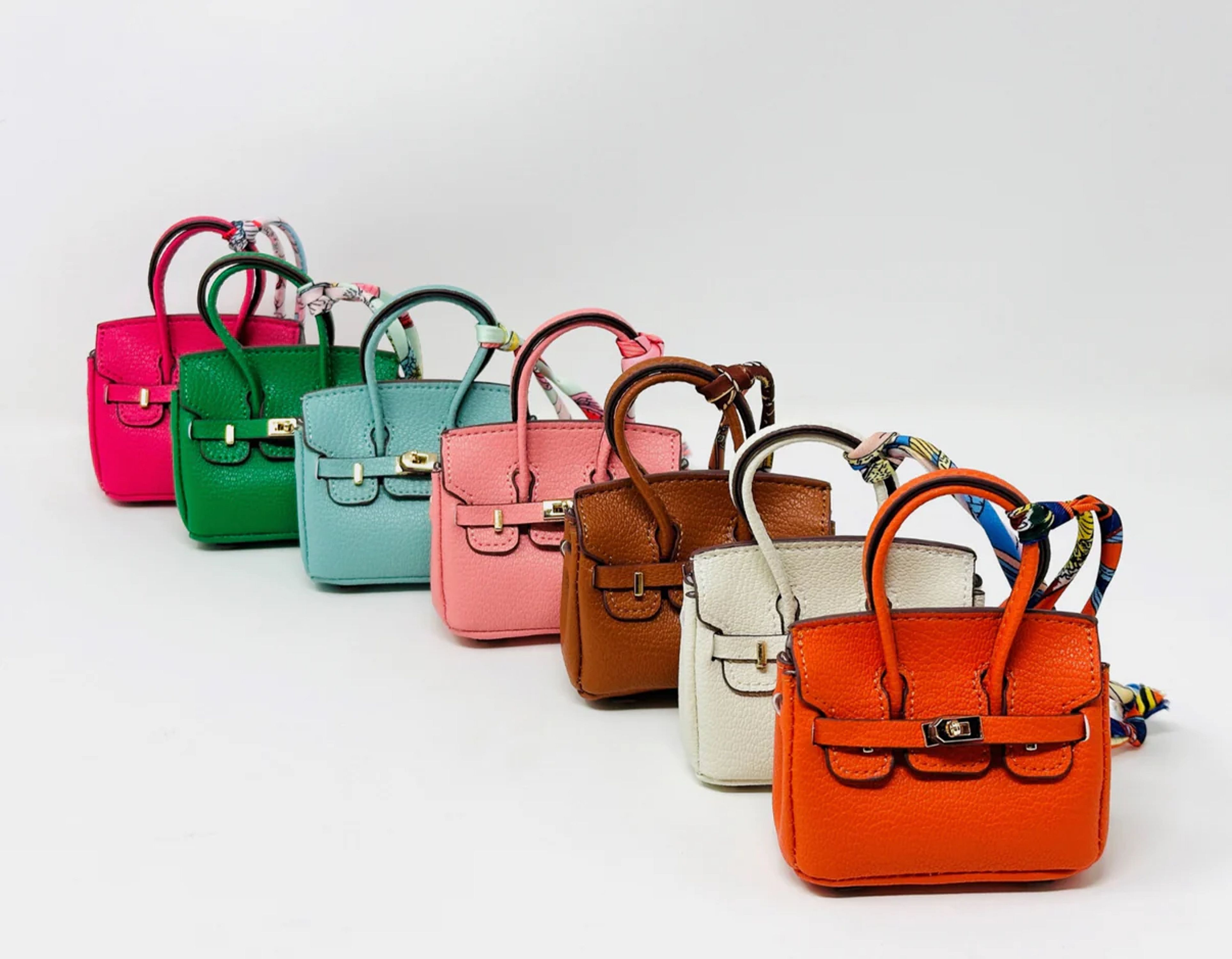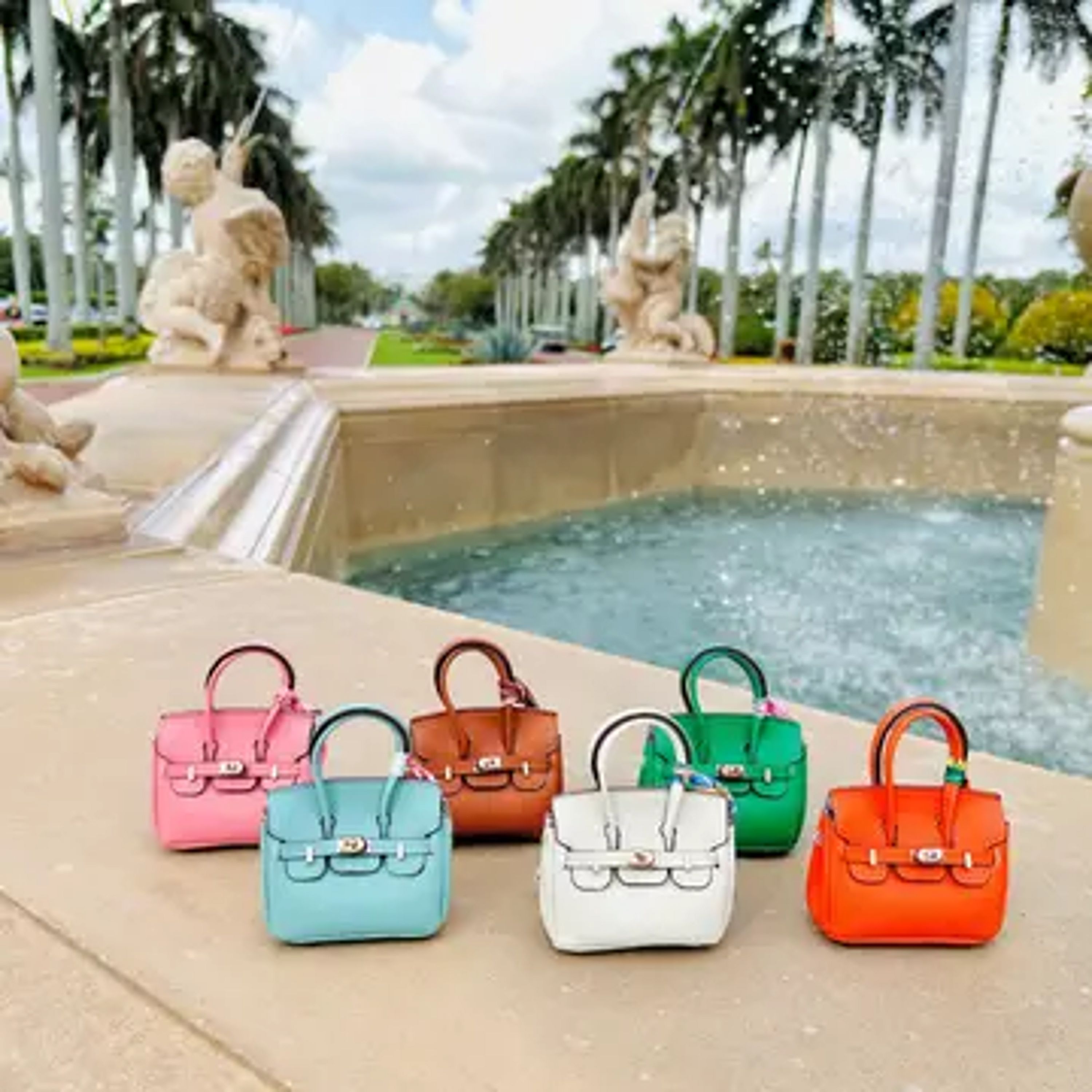 Our mini purse charm is made with microfiber leather. Our purse charm can also be an ornament. You will be the hit of the ornament party this season with our mini purse charm/ornament. All of our purse charms come with a fabric loop so you can attach purse charm to your handbag/tote - refer to the image with the pink handbag. Material: microfiber leather Sizing: 2.5" L x 1" W x 2.25" H (if you include the straps the height is 3.5") Purse Charm Designer Crush Ornament Mini Purse Equestrian.