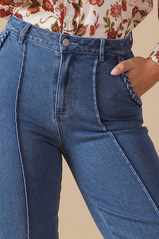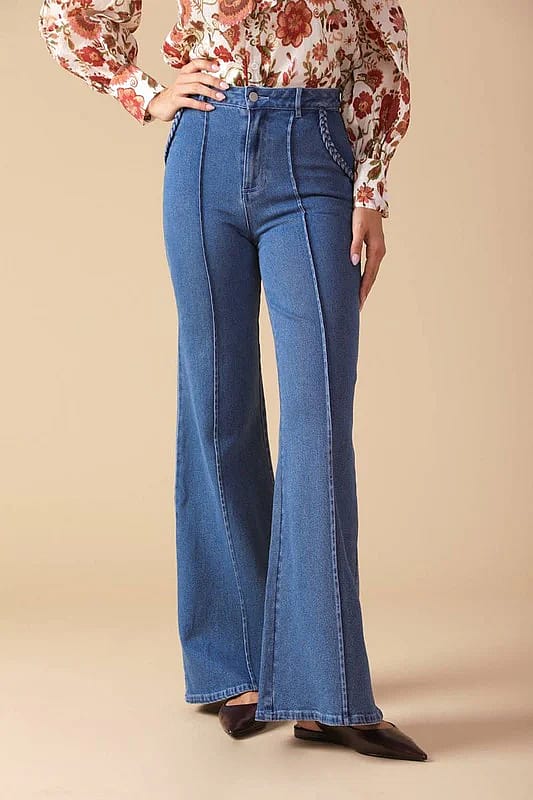 A washed denim pant featuring front closure, braided trimmed pocket and flare leg Details: Self : 68% Cotton 30% Polyester 2% Spandex
