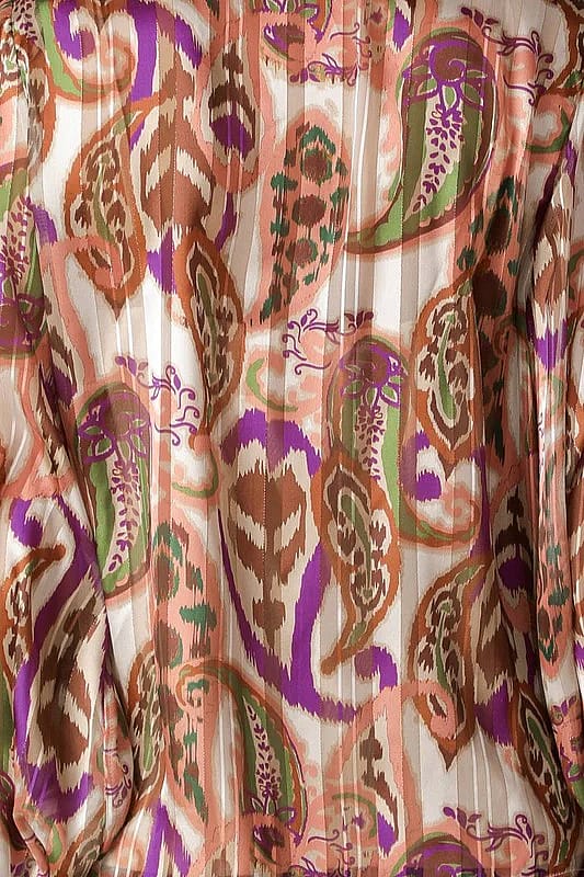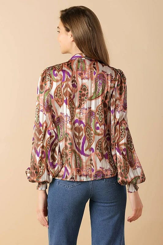 A printed woven top featuring front bow tie and long sleeve with smocked cuff Details. Self fabric 100% Polyester Lining, 100% Polyester
