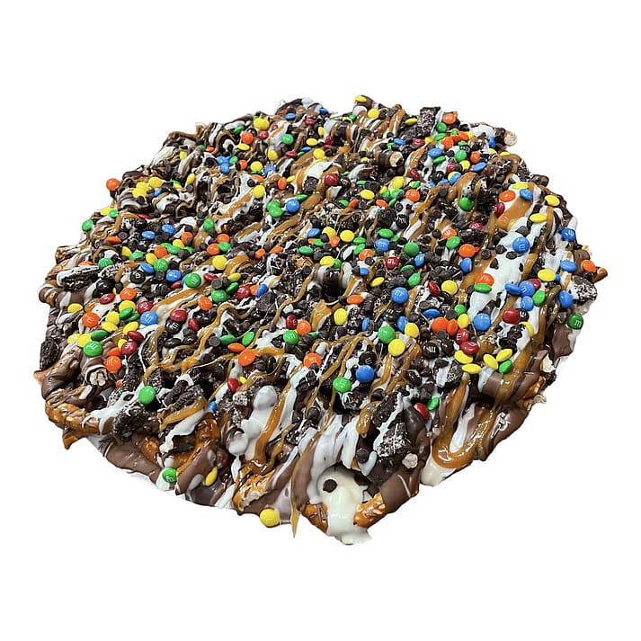 A combination of Milk, Dark & White Chocolate drizzled over pretzels, Oreo pieces, chocolate chips and M&Ms topped with caramel! 14 inch round chocolate pizza co,es in pizza box