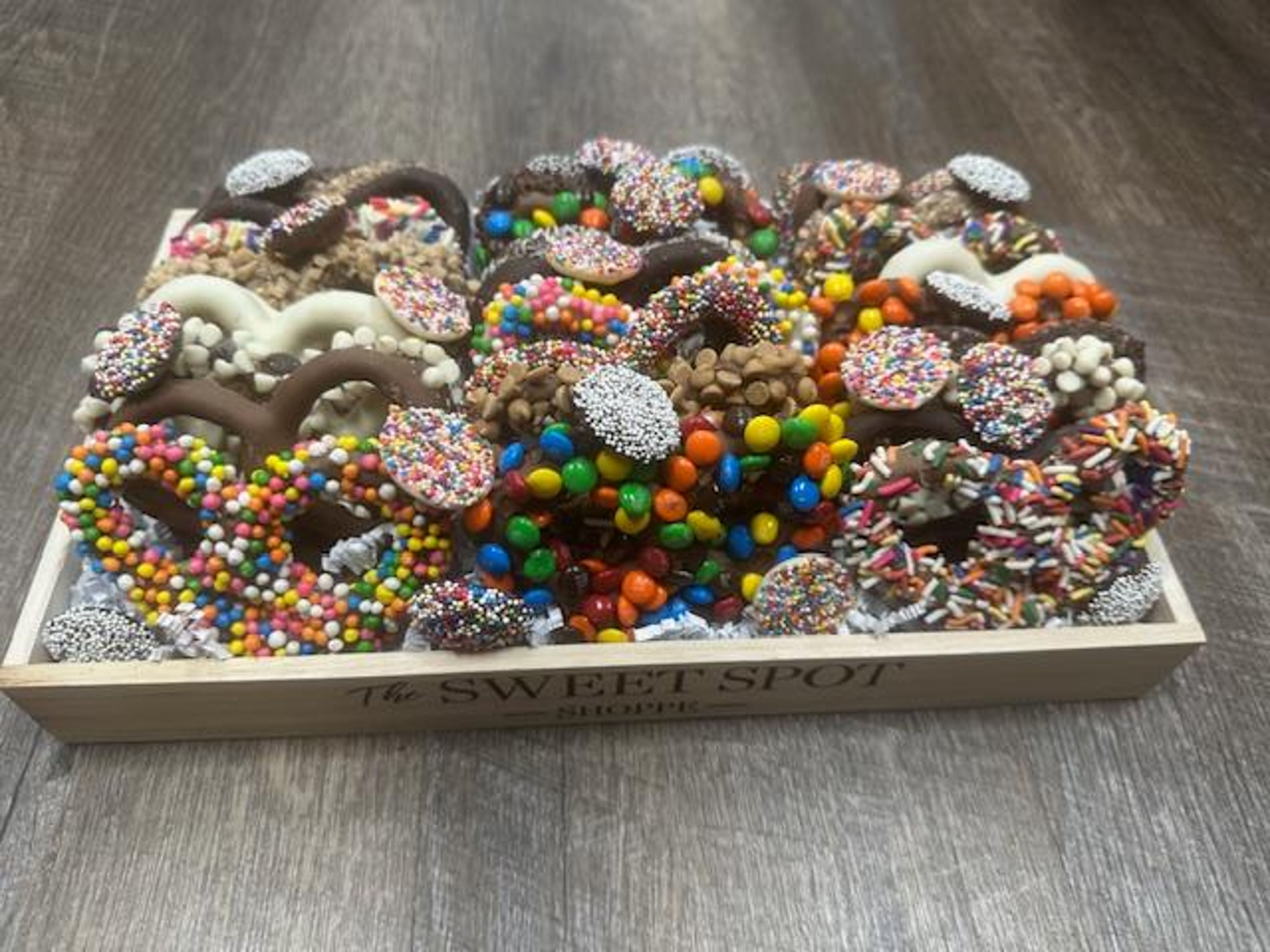 A platter of our chocolate covered pretzels covered with delicious toppings. This is our best-seller for the chocolate-covered pretzel lover!