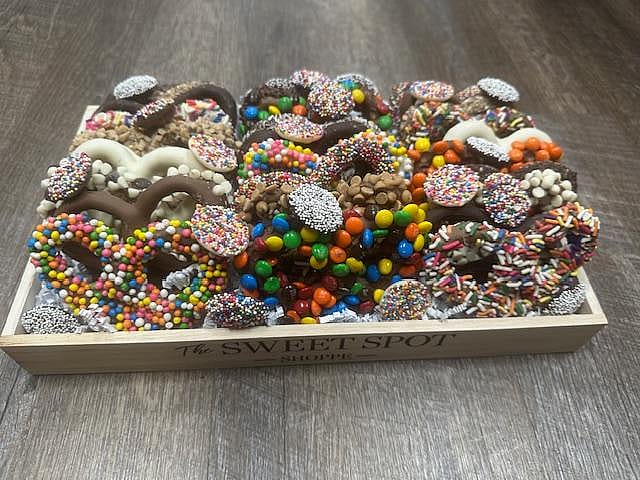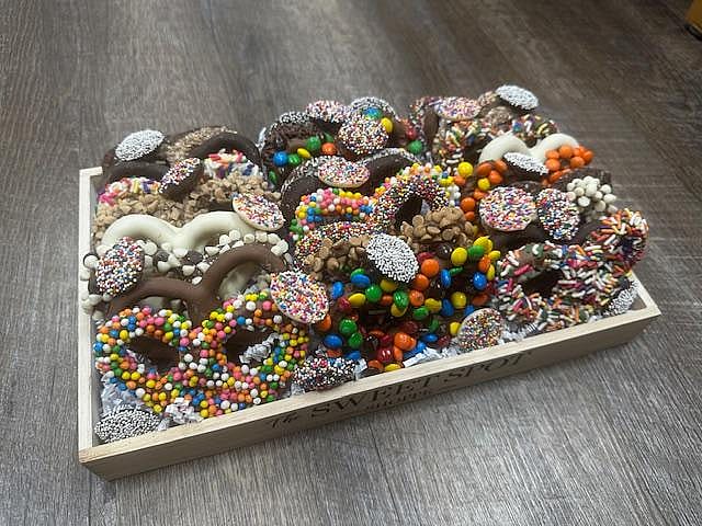Can include Sea Salt DarkPretzels, M&M, Reese's Pieces, Chocolate Chips, Toasted Coconut, Toffee, Peanut Butter Chips, Sprinkles & Non-Pareils, Milk, Dark & White Chocolate pretzels and more.