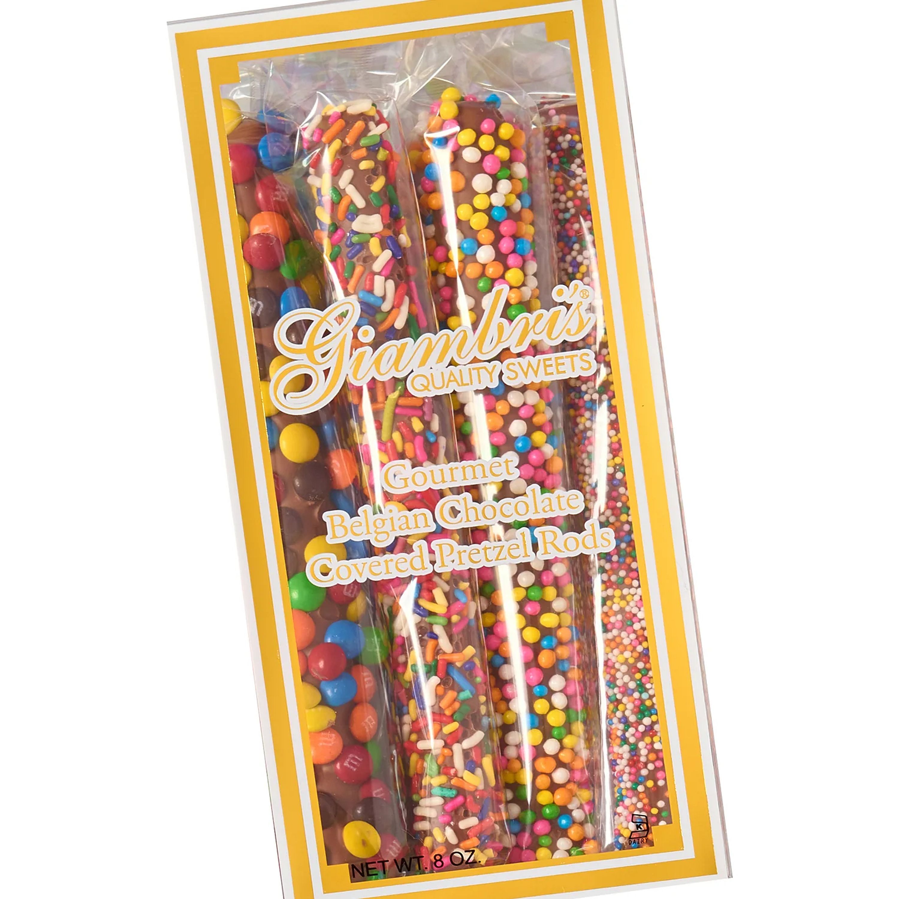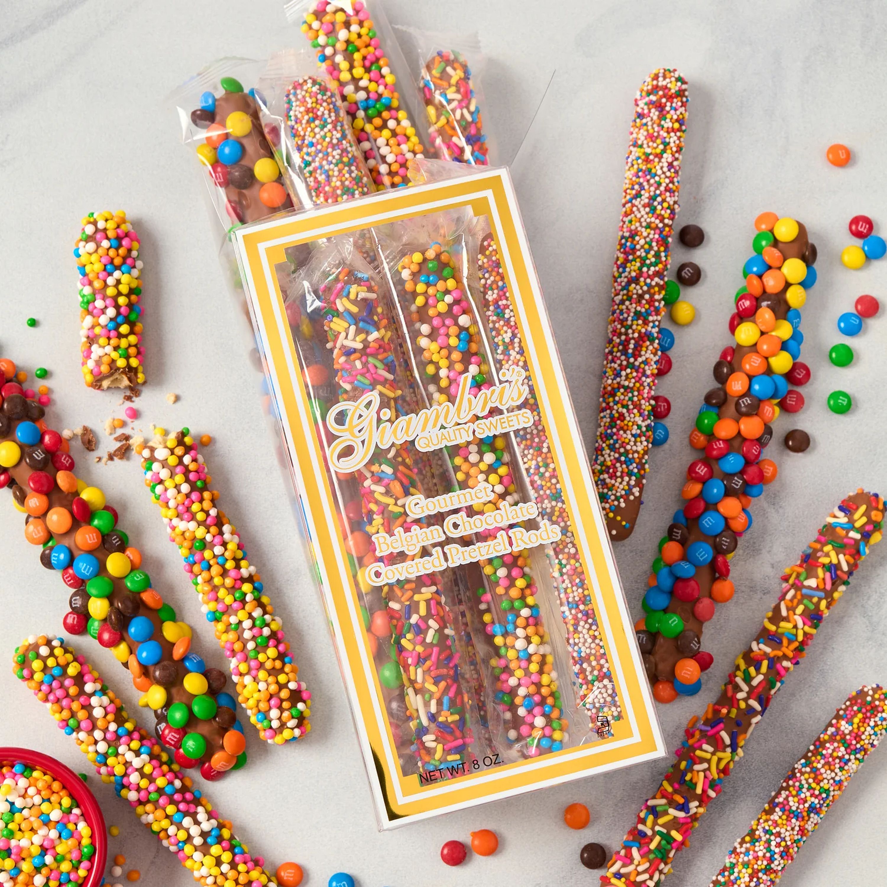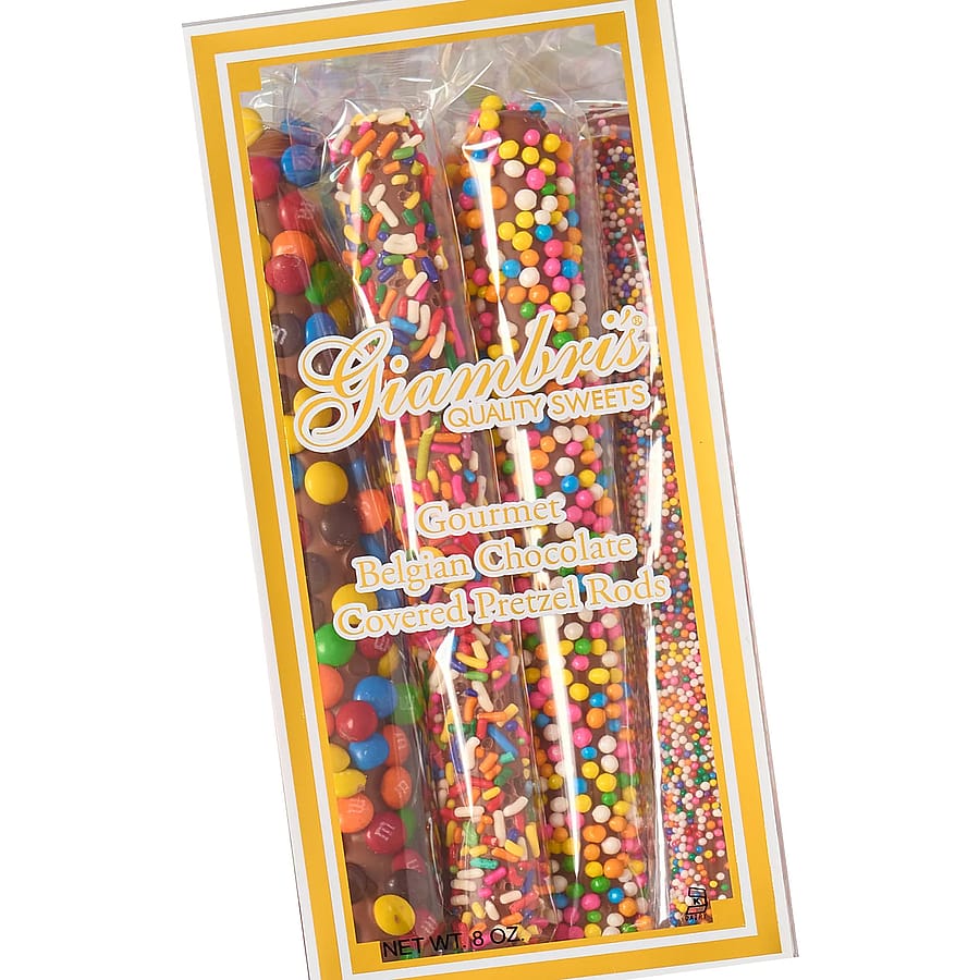 An 8 oz. Gift Box of individually wrapped Gourmet Belgian Milk Chocolate Covered Pretzel Rods topped with M&M's, Crispy Pearls, Rainbow Jimmies and Non-Pareils