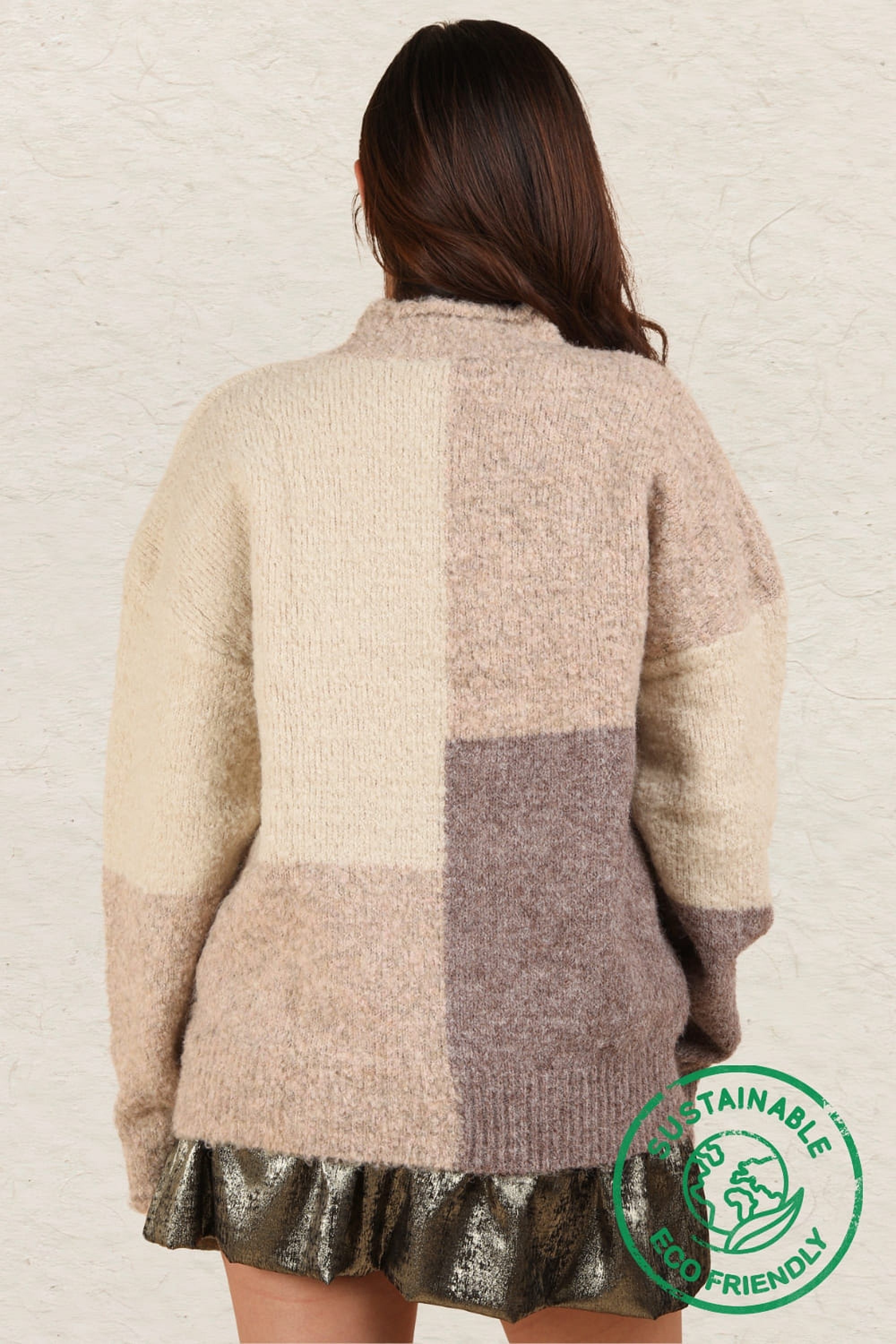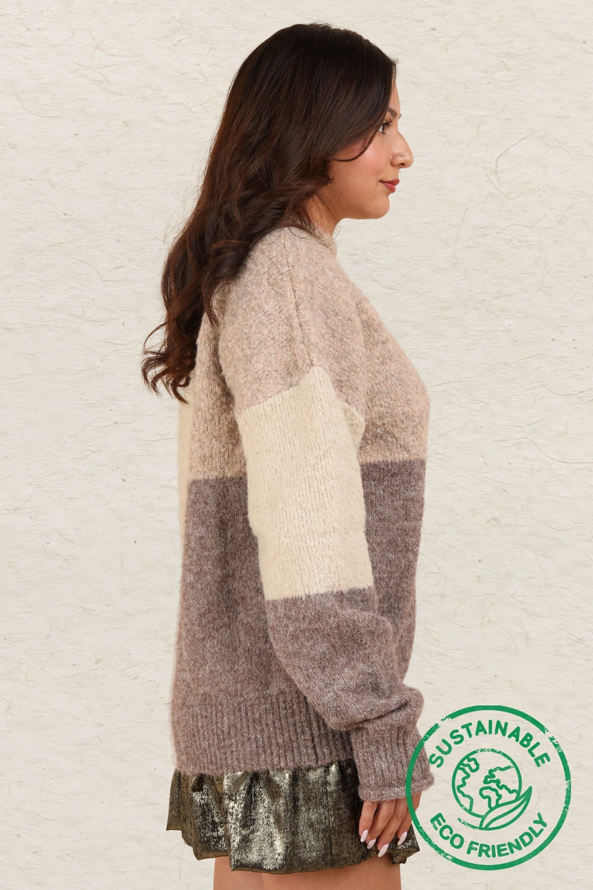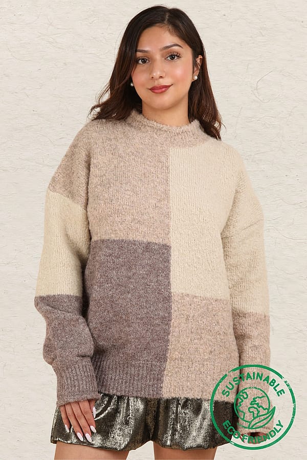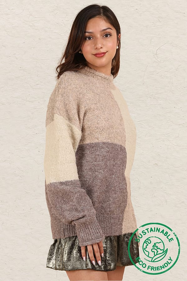 Experience the luxury of ethical and sustainable fashion with our Color Block Sweater Top! Made with the highest quality materials, this oversized cozy knit top features a round neckline, rolled sleeve edges, and drop shoulders for a chic and comfortable look. The slow fashion approach and use of eco-friendly and recyclable materials make this a must-have addition to your wardrobe. Join the zero waste movement and make a statement with our new ethical sweater top today!