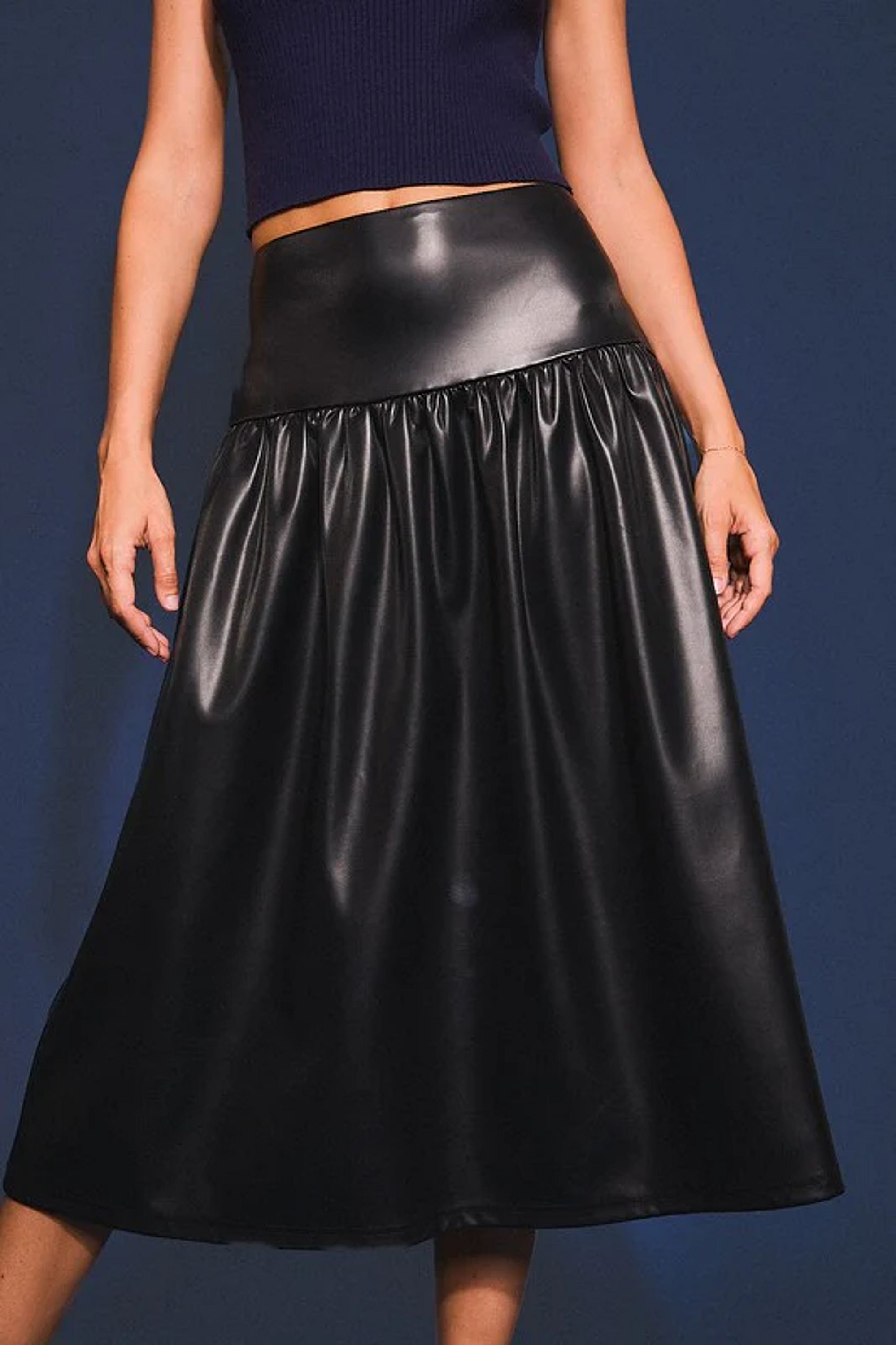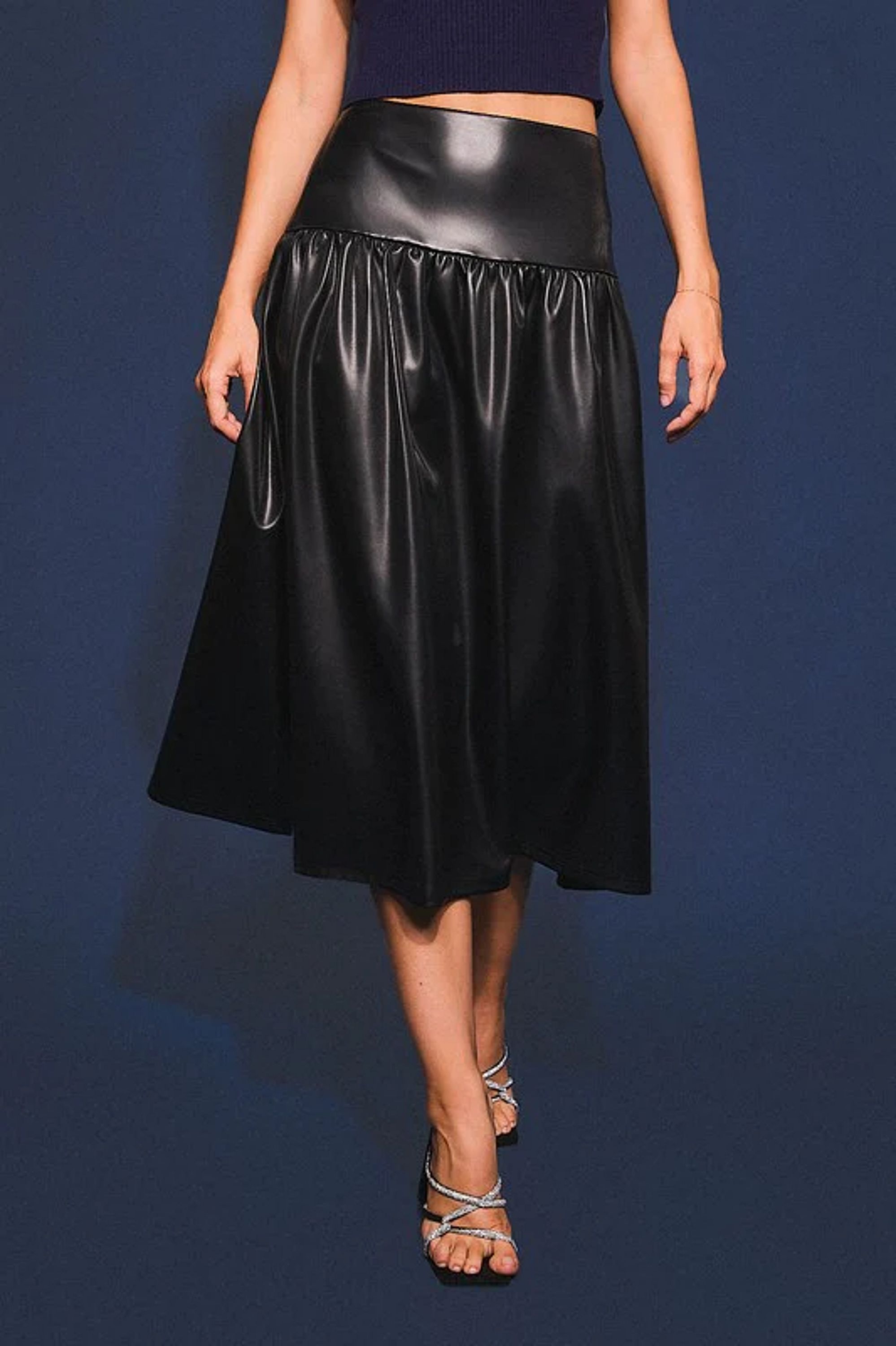 Soft Leather with stretch Leather Vegan Midi Skirt. A fun for the holidays skirt. Wear with any sweater, blouse, bodysuit to create a fun look.