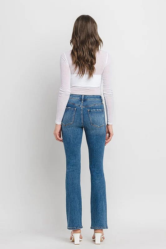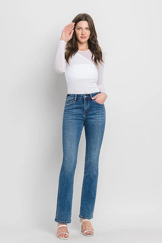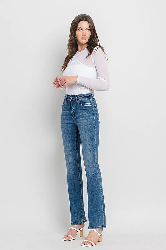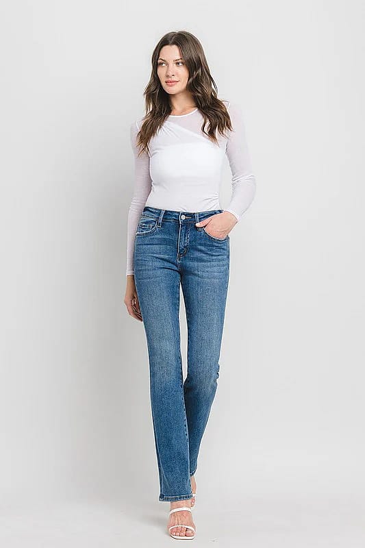 HIGH RISE WIDE LEG JEANS COMFORT STRETCH DENIM, HIGH RISE WAIST, FINISHED HEM, FULL LENGTH, WIDE LEG JEANS F. RISE: 10" / INSEAM: 32" / LEG OPENING: 20" MODEL IS 5'9" WEARING SIZE 26.
