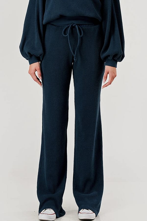 Semi wide leg waffle Garment dye knit bottoms with drawstring waistline. Top sold separately.