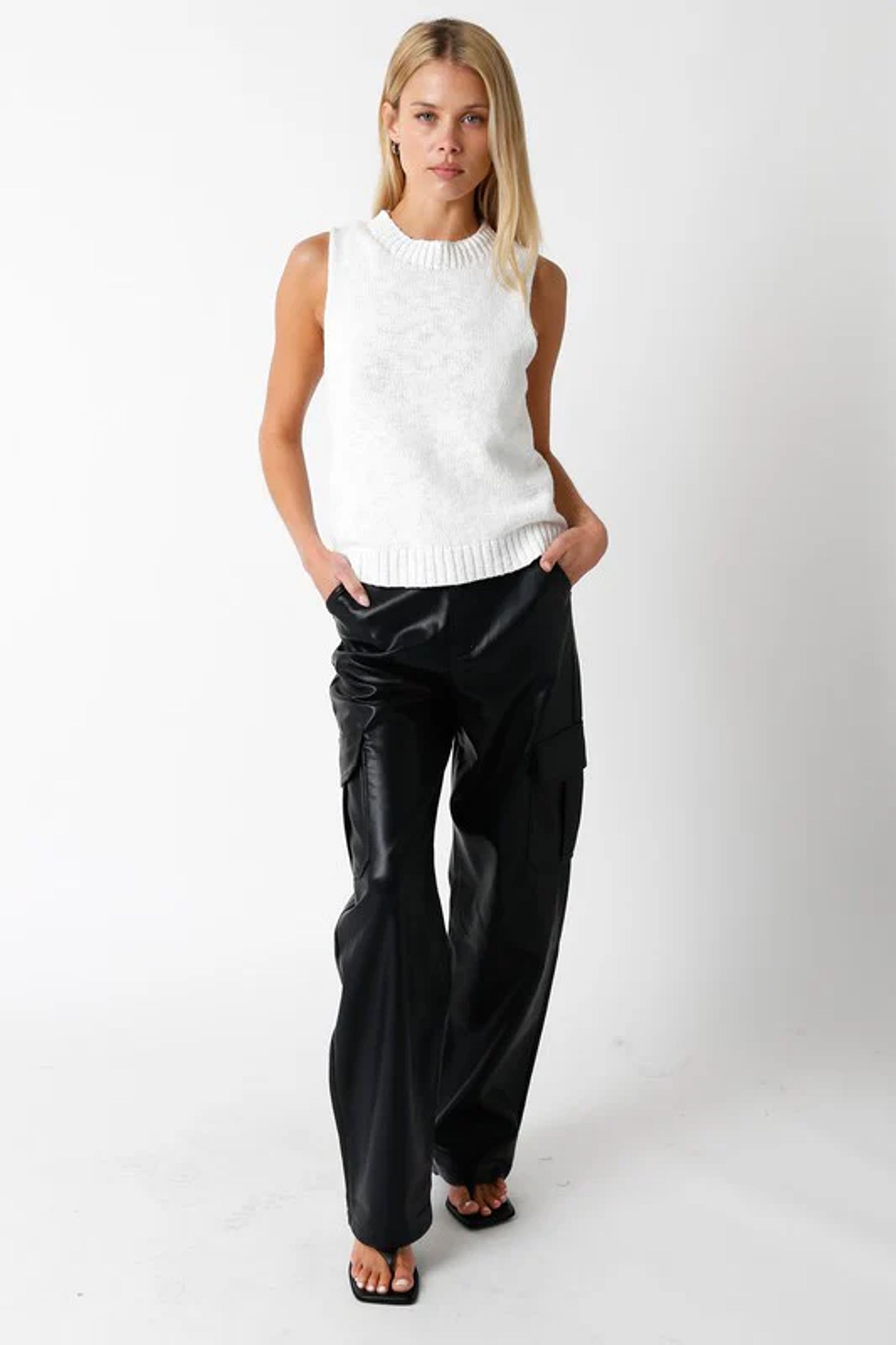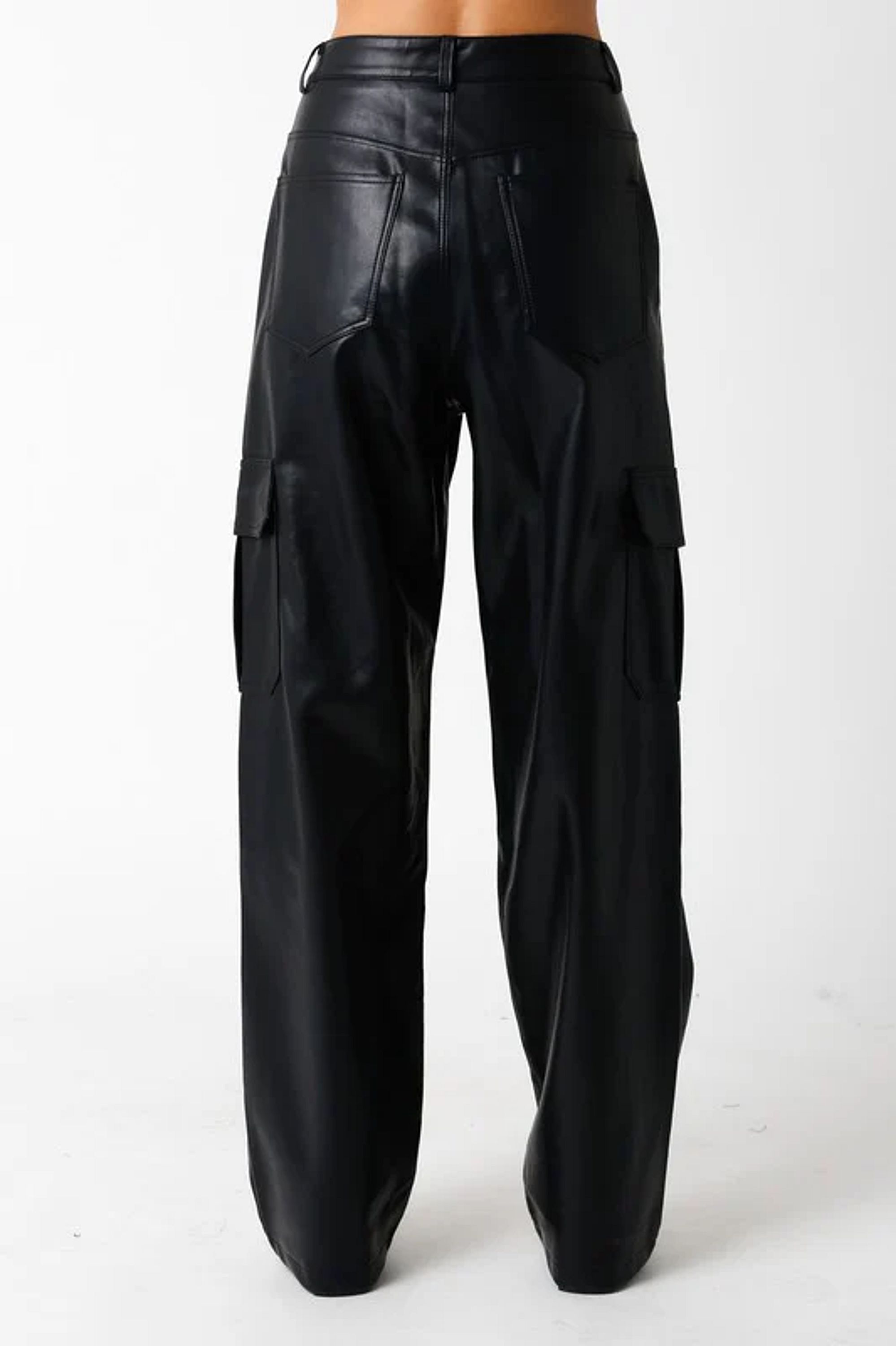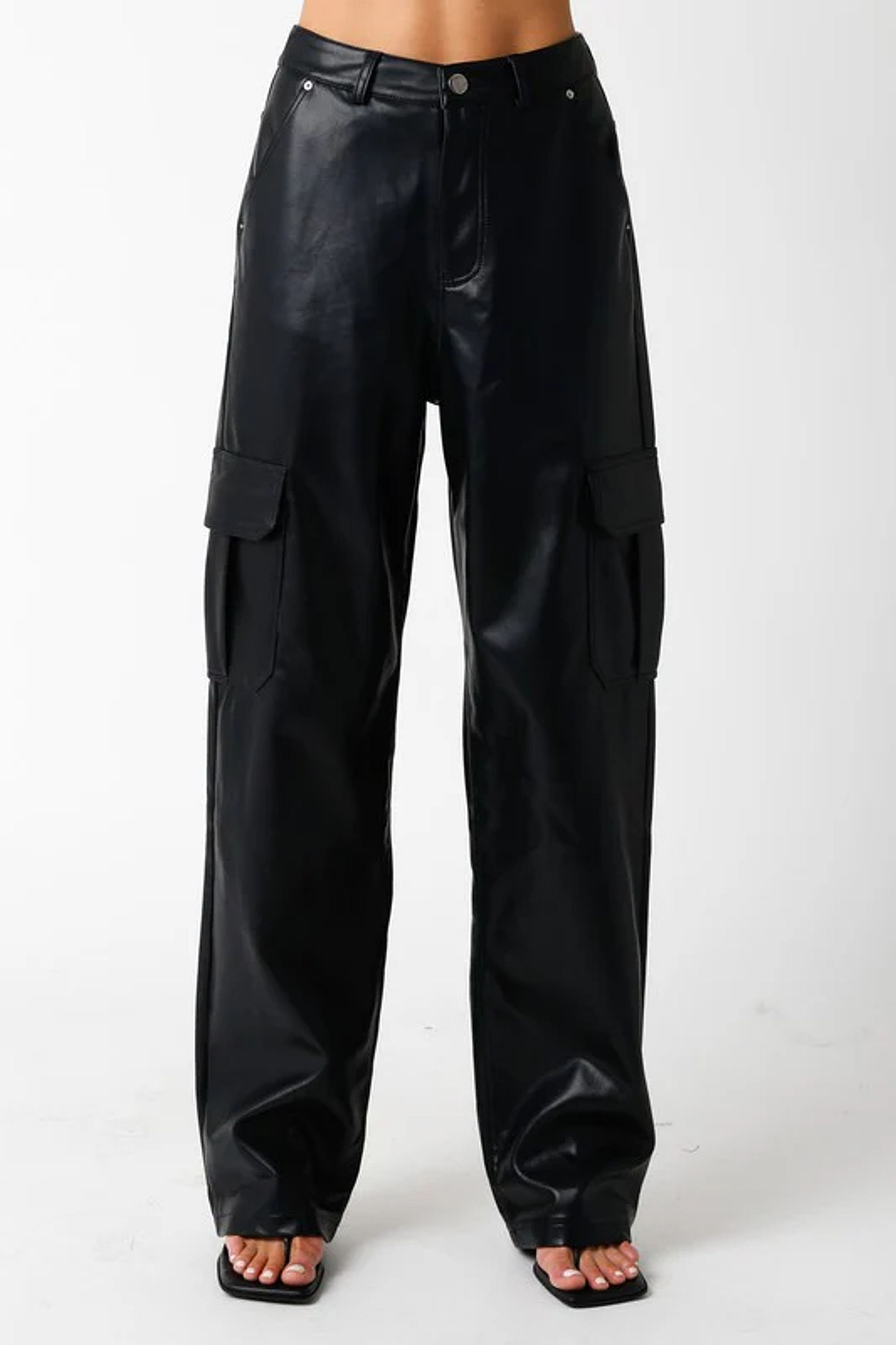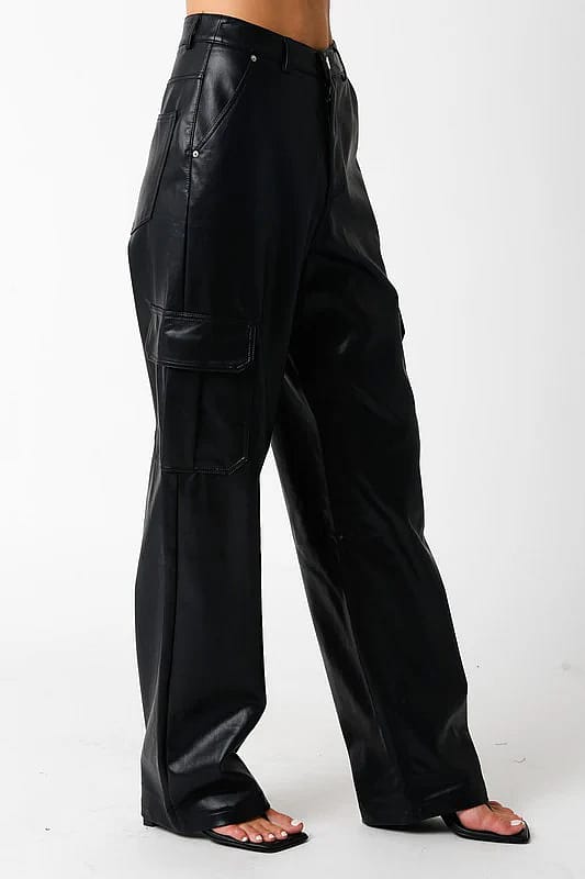 Our Vegan leather Pu Cargo Pants features a full length and a pocket Woven. Straight cut fabric with a high rise. Butter soft fabric with stretch. Self: 45% pu 55% cotton Lining: 100% rayon
