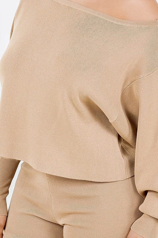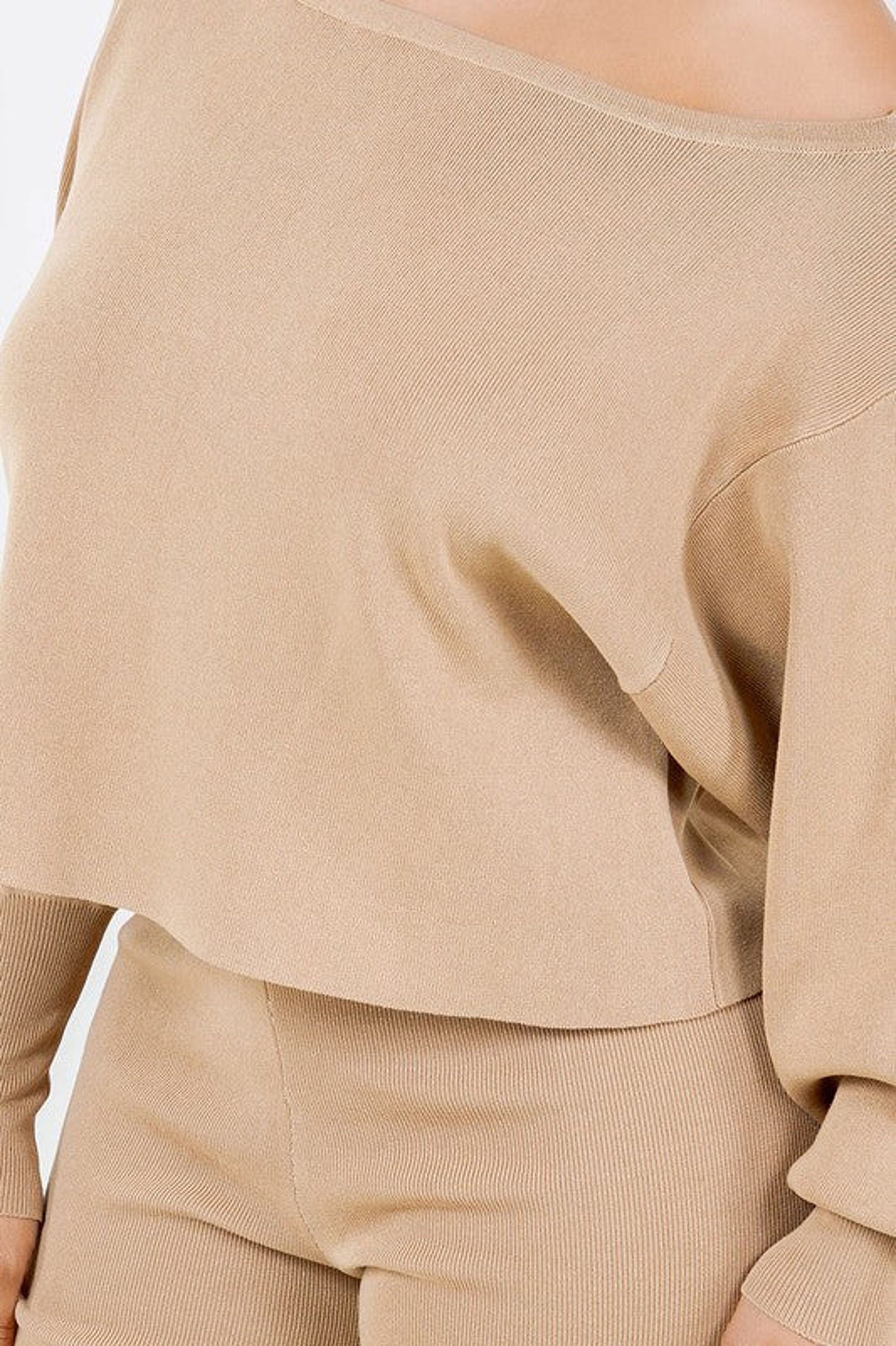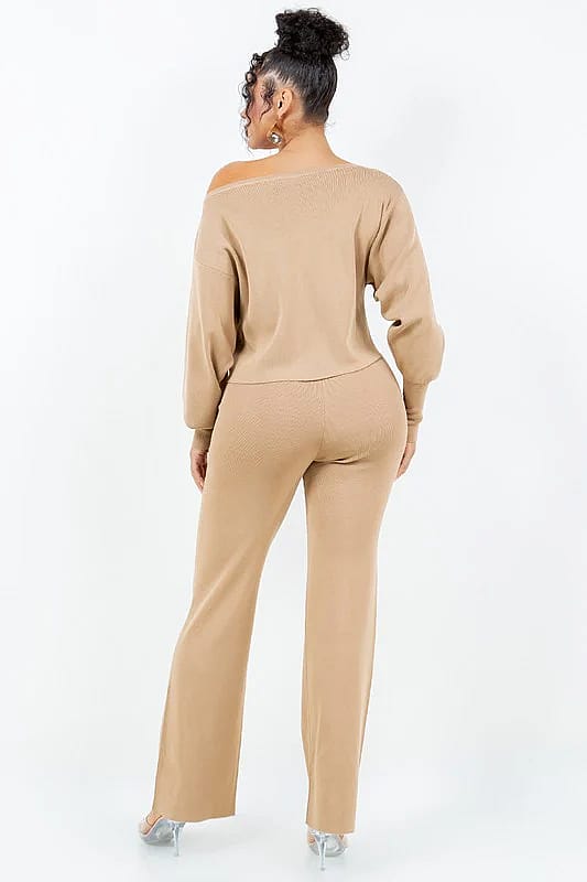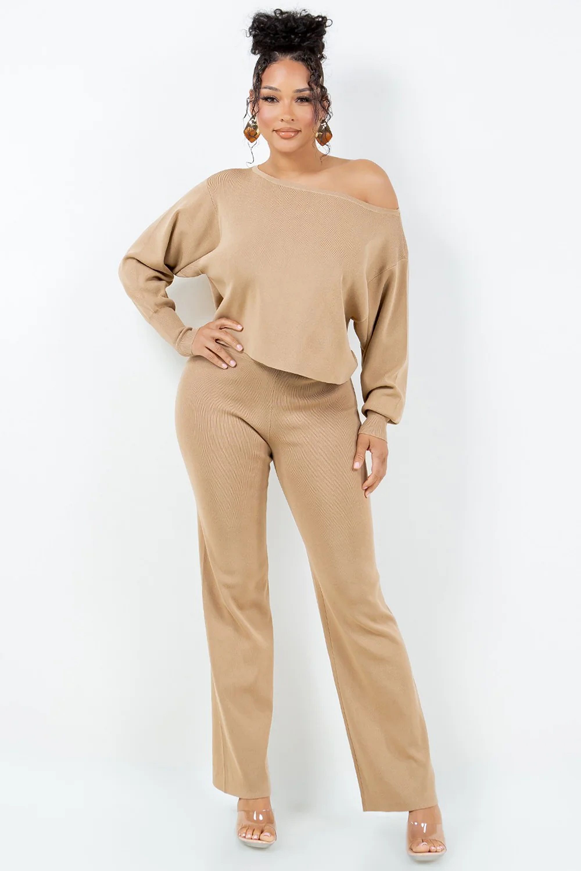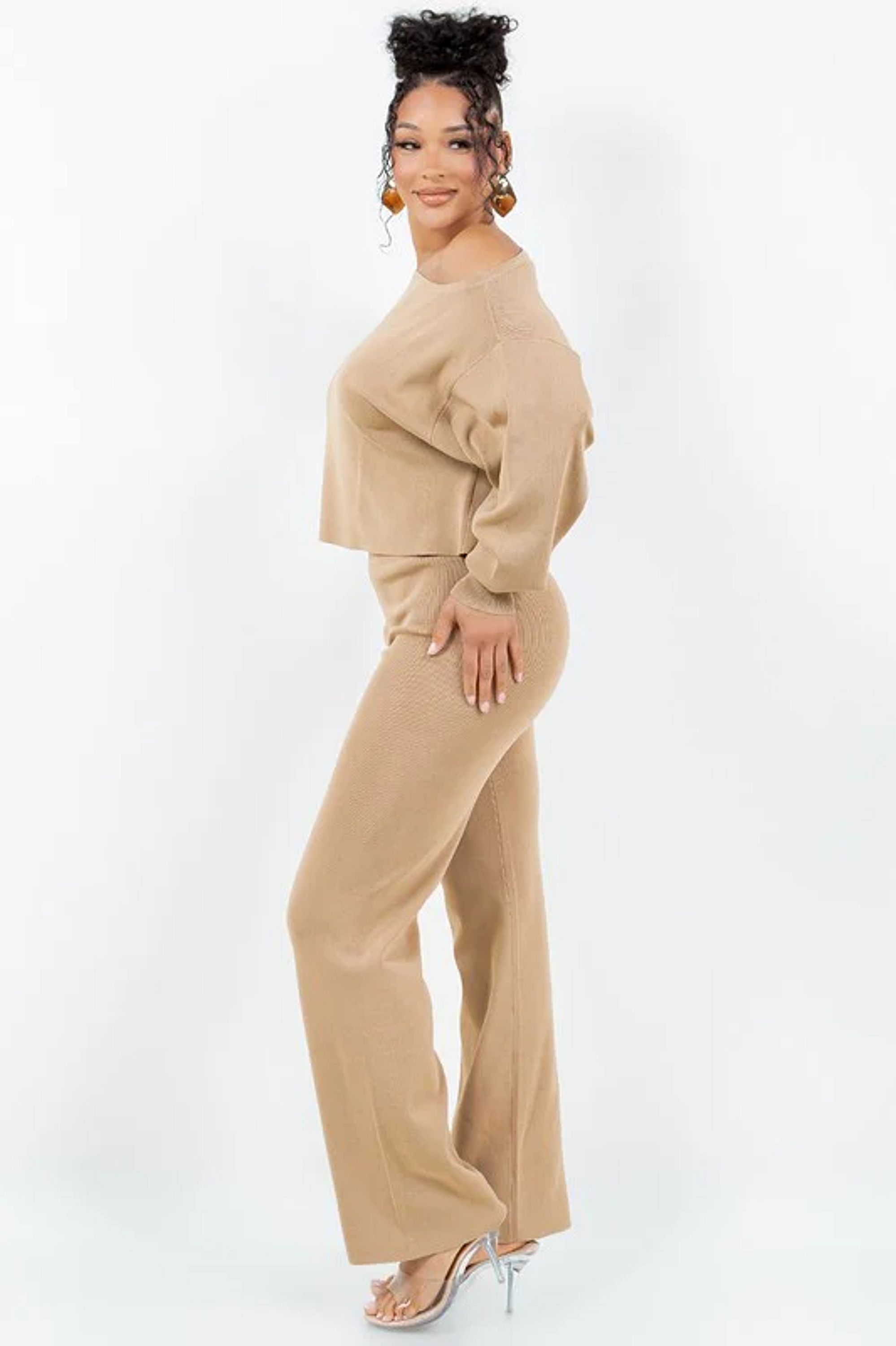 Casually prepared in this new set. Dropped shoulder ribbed knit set. Straight leg pants.