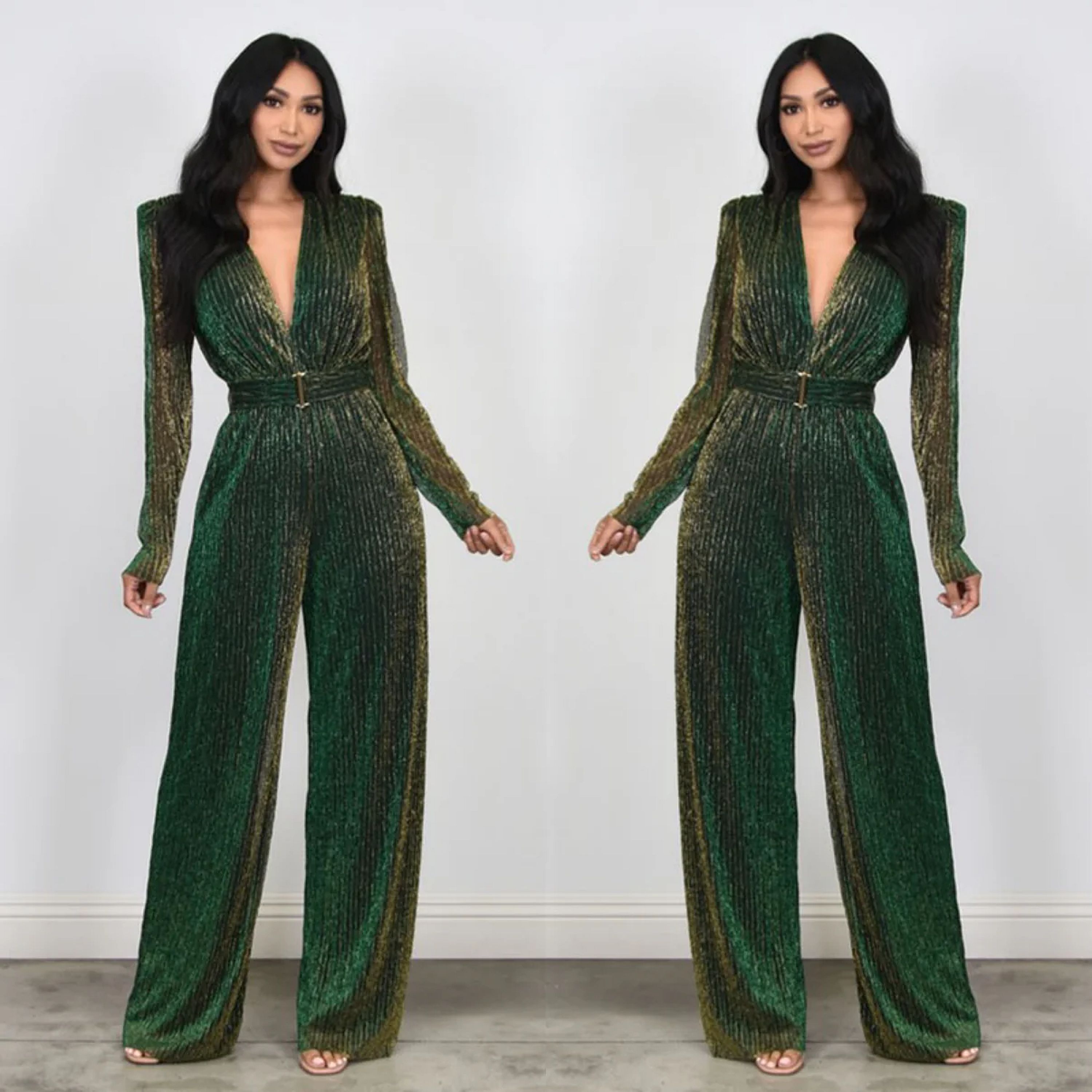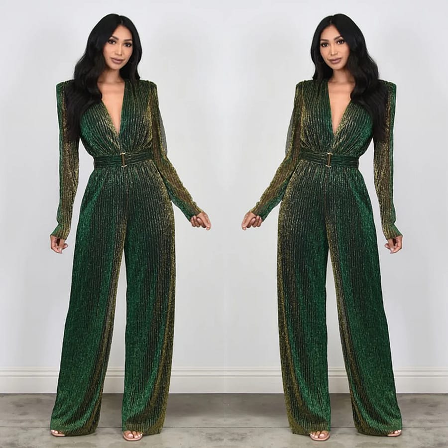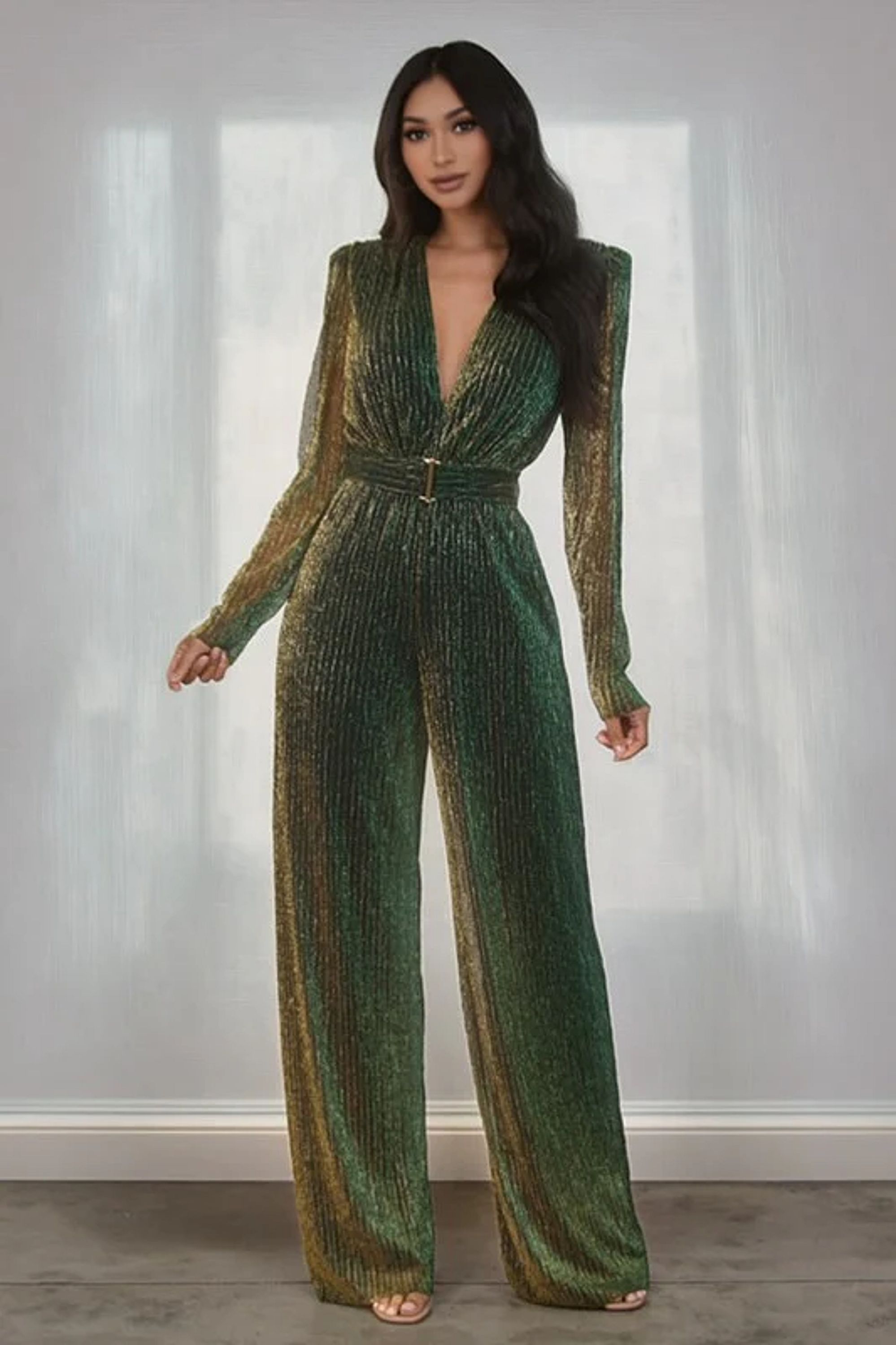 Let’s make it one unforgettable night in our new Metallic Mesh crinkle jumpsuit. Fabric has amazing stretch. Loose fit. Self fabric elastic waist and matching belt. A large fits up to an XL.