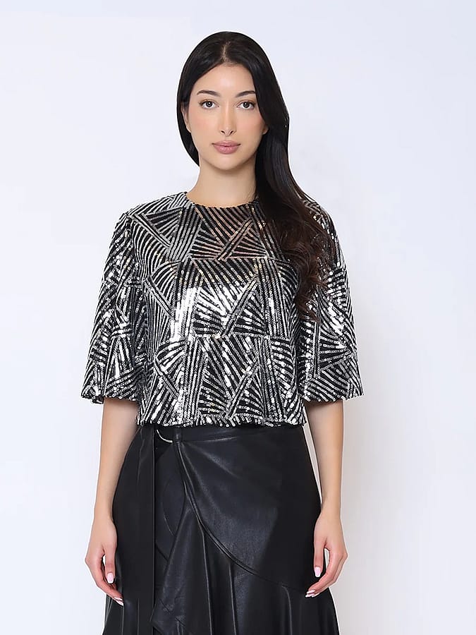 Make it fun for the holidays. Fully line sequins poly fabric sleeves with bell sleeves. Zip opening at back.