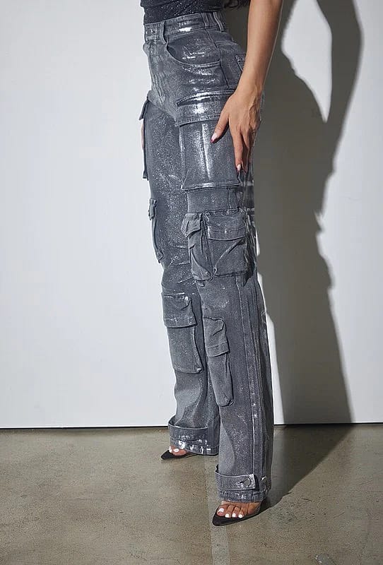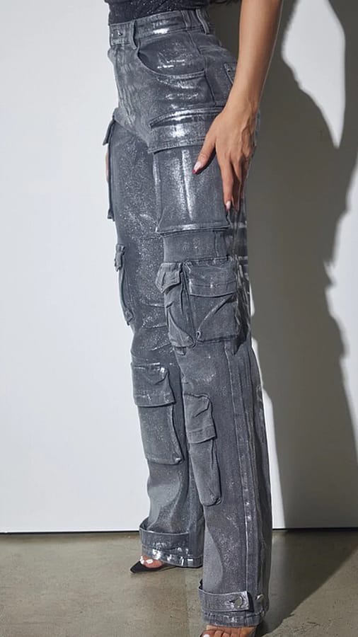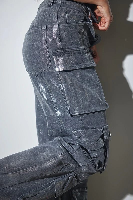 Elevate your style with our Luxe Metallic Denim Cargo Pants! These stunning, foil-finished cargo pants come in trendy purple and chic metallic black, designed for the modern woman who loves to stand out. Crafted from high-quality denim with just the right amount of spandex, they offer a flattering fit that moves with you. Featuring a remarkable 10 pockets, these pants combine fashion and functionality, making them perfect for the on-the-go woman. The adjustable straps at the cuffs let you style them as joggers or keep them loose for a more relaxed look. Whether you're hitting the town, meeting friends, or just looking to turn heads, these cargo pants are your secret weapon for making a statement. Don't miss your chance to shine-add the Luxe Metallic Denim Cargo Pants to your collection today and be the sensation wherever you go!