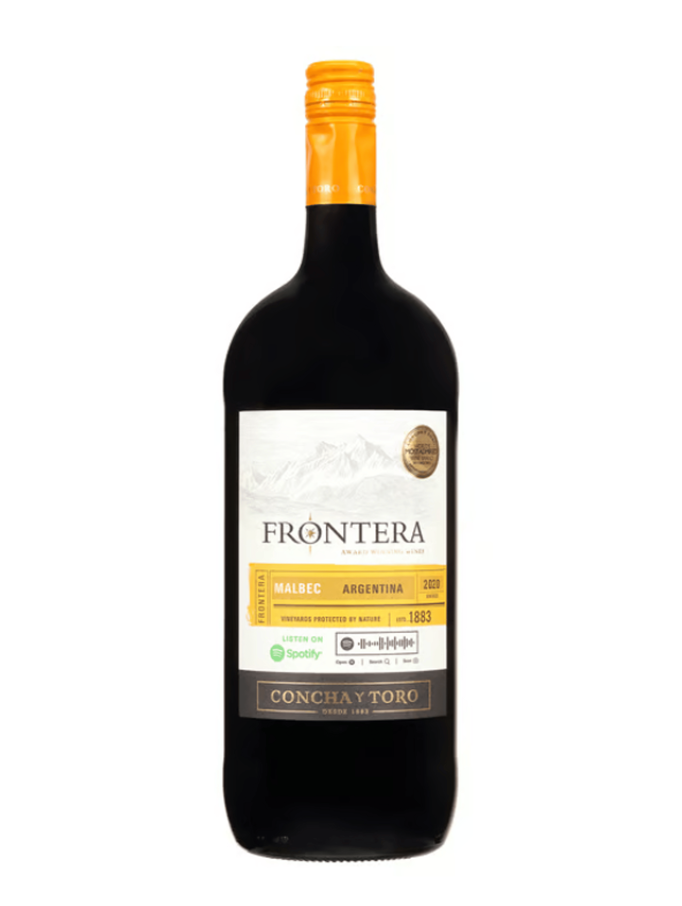 Vineyards protected by nature. Vintage. Estd 1883. Robust aromas of forest fruits and plum entice you to explore this vivacious Malbec; with fruit-forward flavors it perfectly complements your grilling skills whether it be a leg of lamb, a juicy steak, or a roast. - Rafael Miranda, Winemaker. fronterawines.com. Listen on Spotify: Open. Search. Scan. Facebook/fronterawines. World's most admired wine brand. 2011/2012/2013. Award winning wines. 12.5% alc./vol. 25 Red Wine - Product of Argentina. Produced and bottled by Trivento Bodegas Y Vinedos S.A. NB-72110 N Exp: B-88365 Mendoza, Argentina.