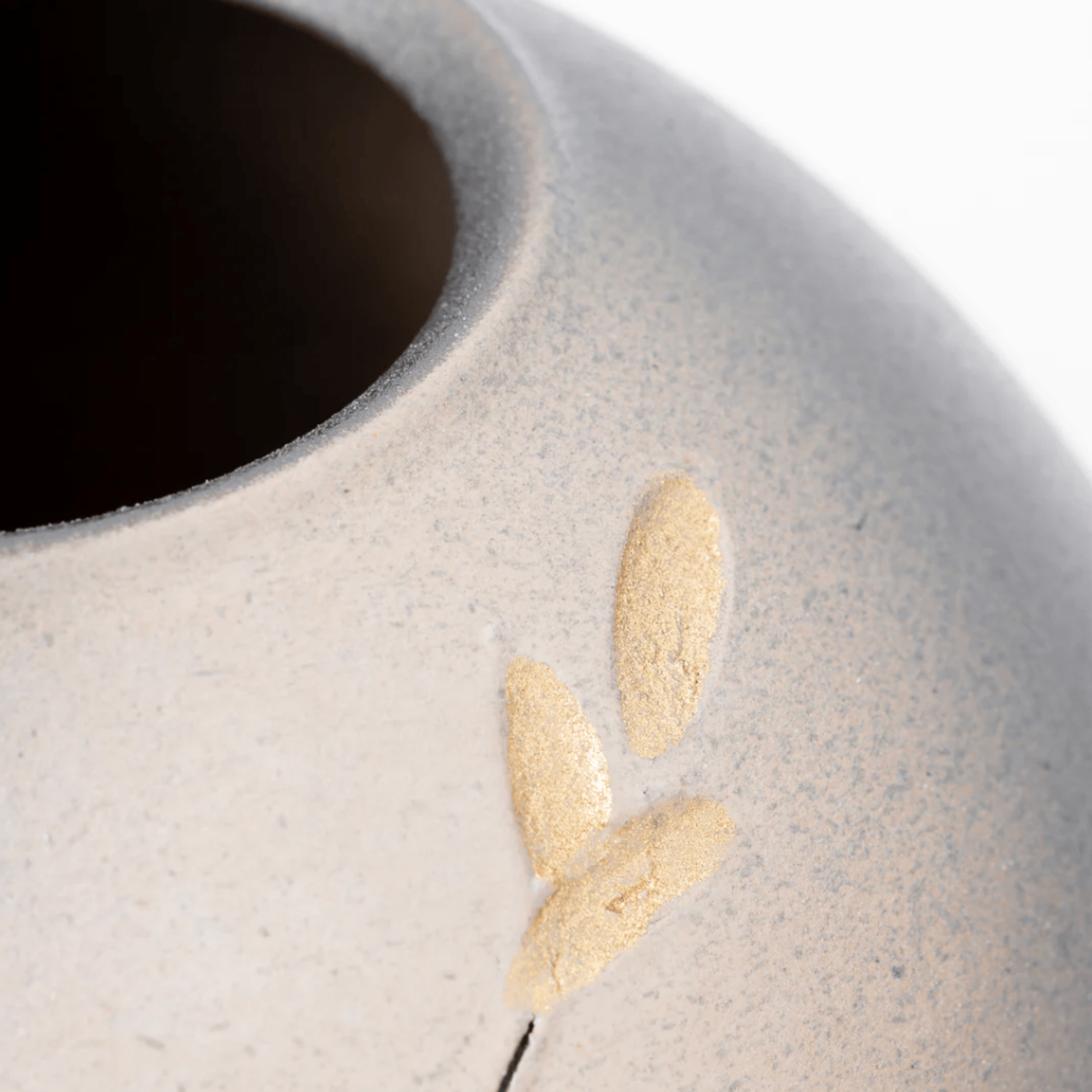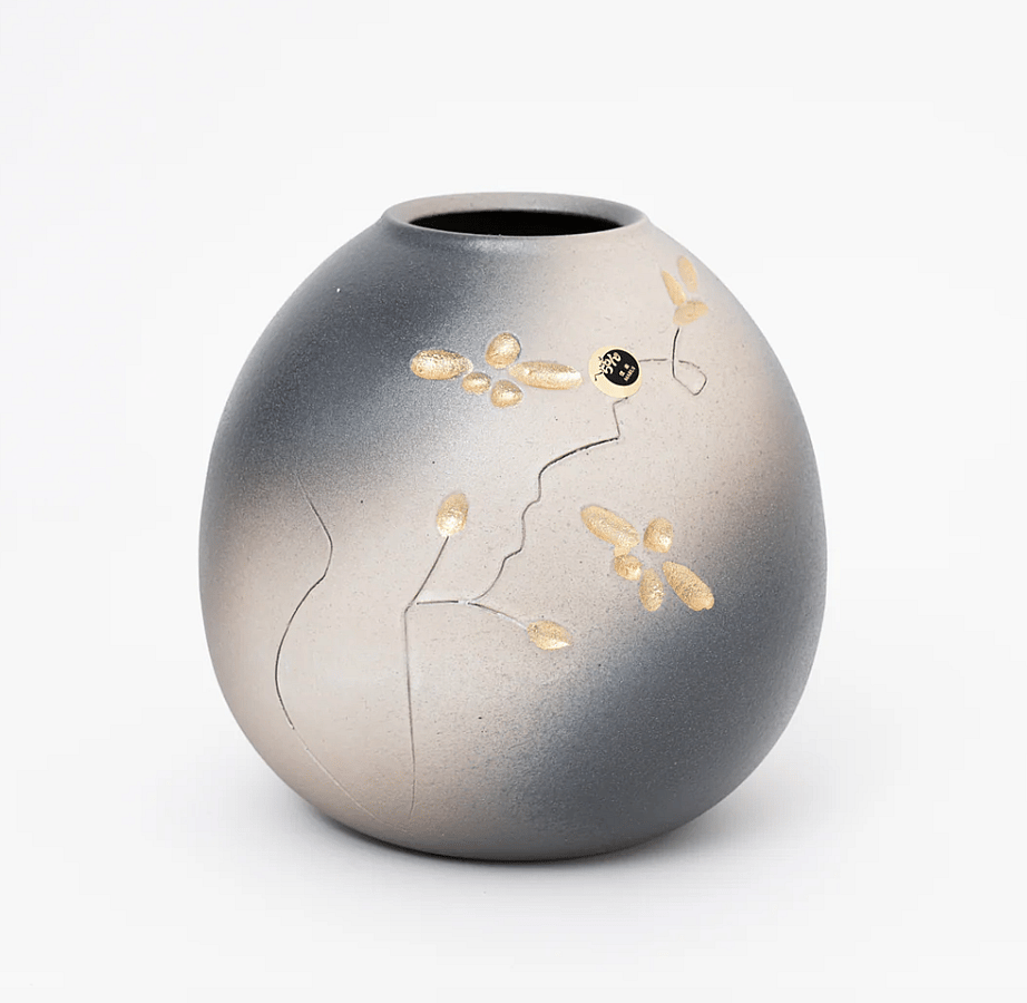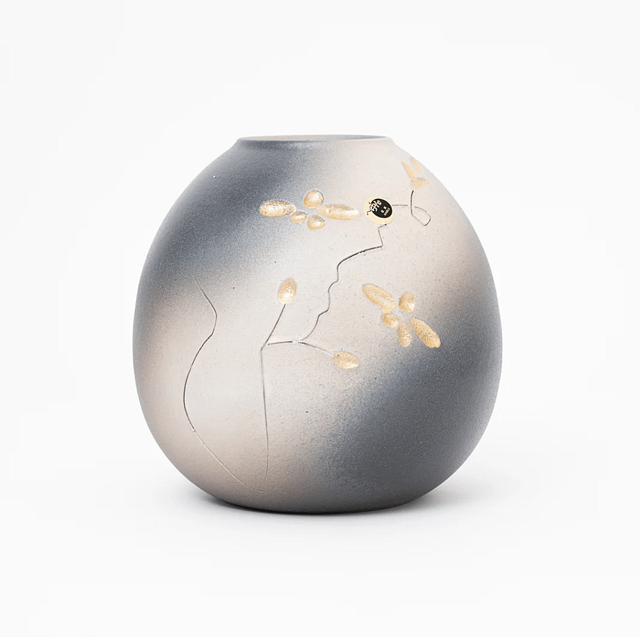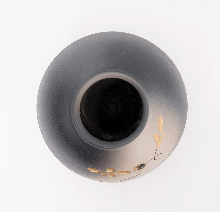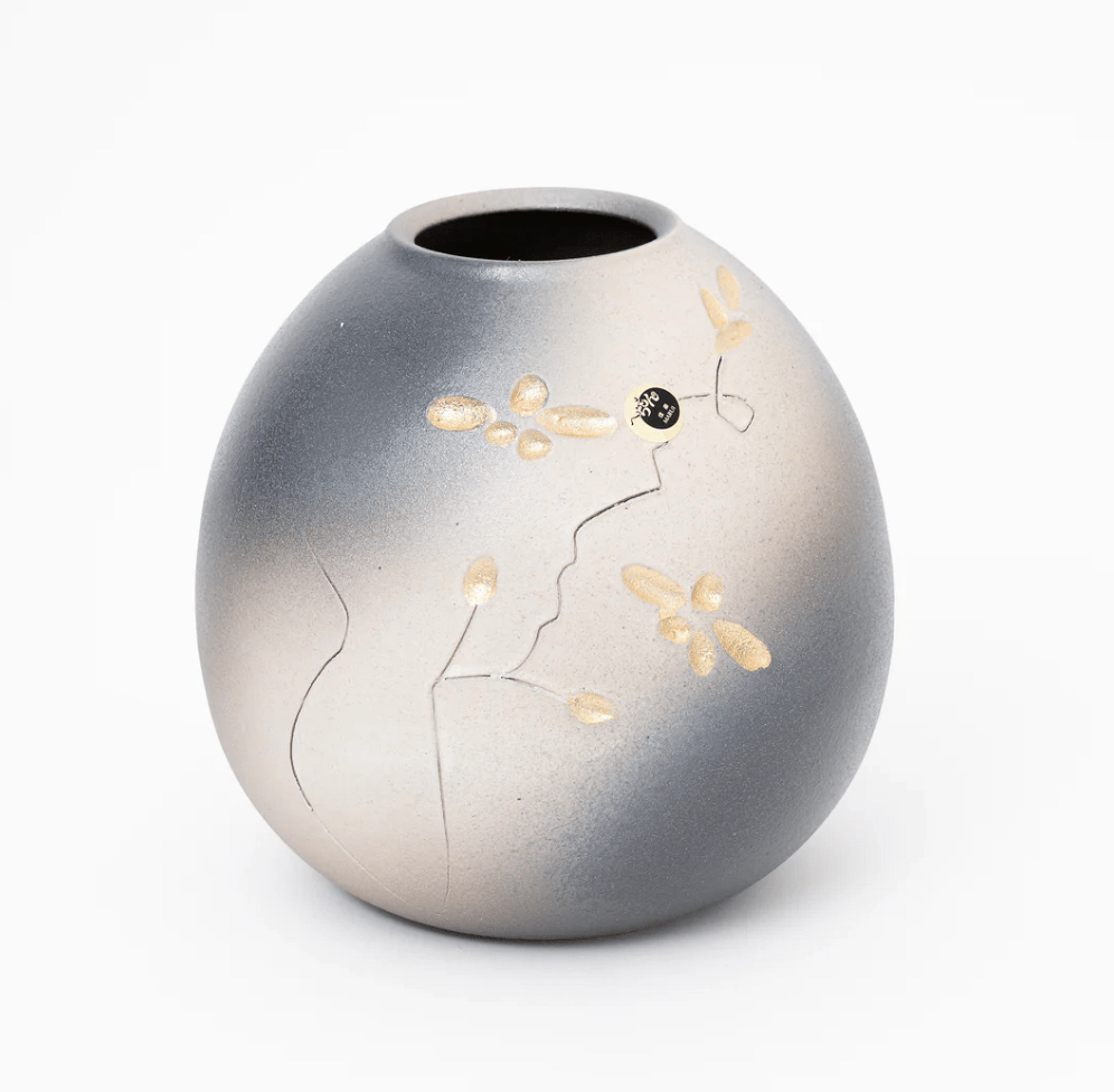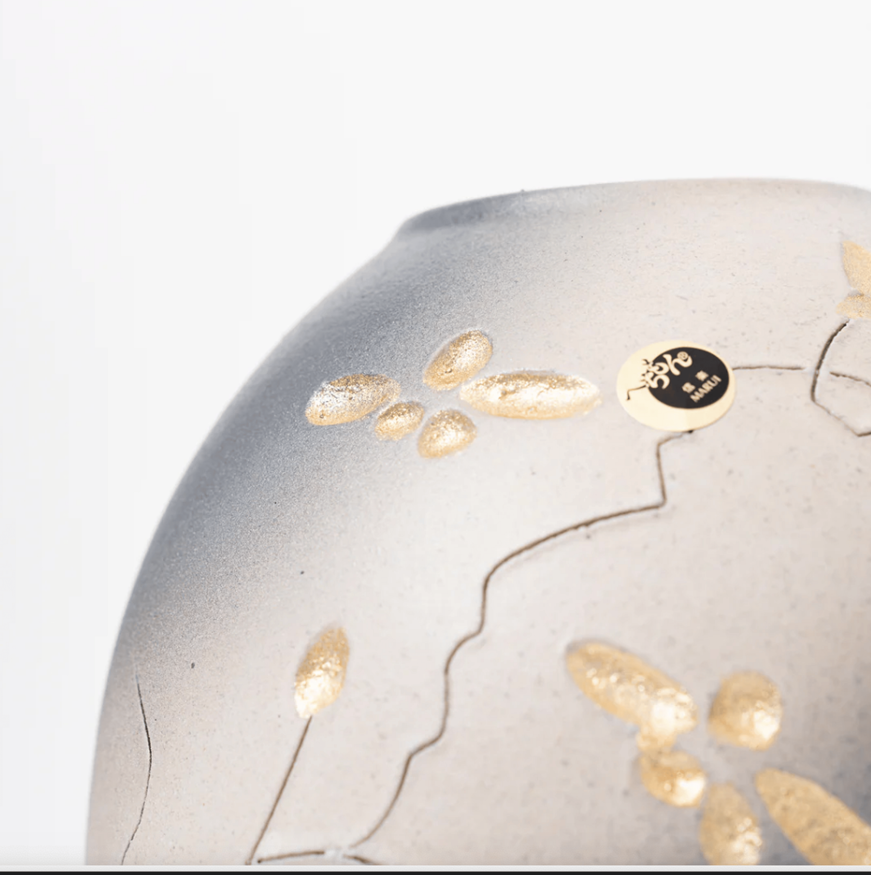 This Shigaraki ware vase features a monotone gradation reminiscent of a tranquil, moonlit night, with delicate accent flowers carved on its surface and golden powder artfully depicting the reflections of moonlight. Its elegant design promises to impart a serene and sophisticated ambiance to any interior space. Whether showcased as a standalone accent piece or filled with flowers or greenery, this vase is sure to enhance your home decor. Shigaraki ware, renowned for its rough, fire-resistant clay sourced from Lake Biwa, is cherished for its ability to enrich the colors of floral arrangements, making them appear even more vibrant and lively, making it an ideal choice for Japanese-style flower vases and a beloved element in the world of tea ceremonies.