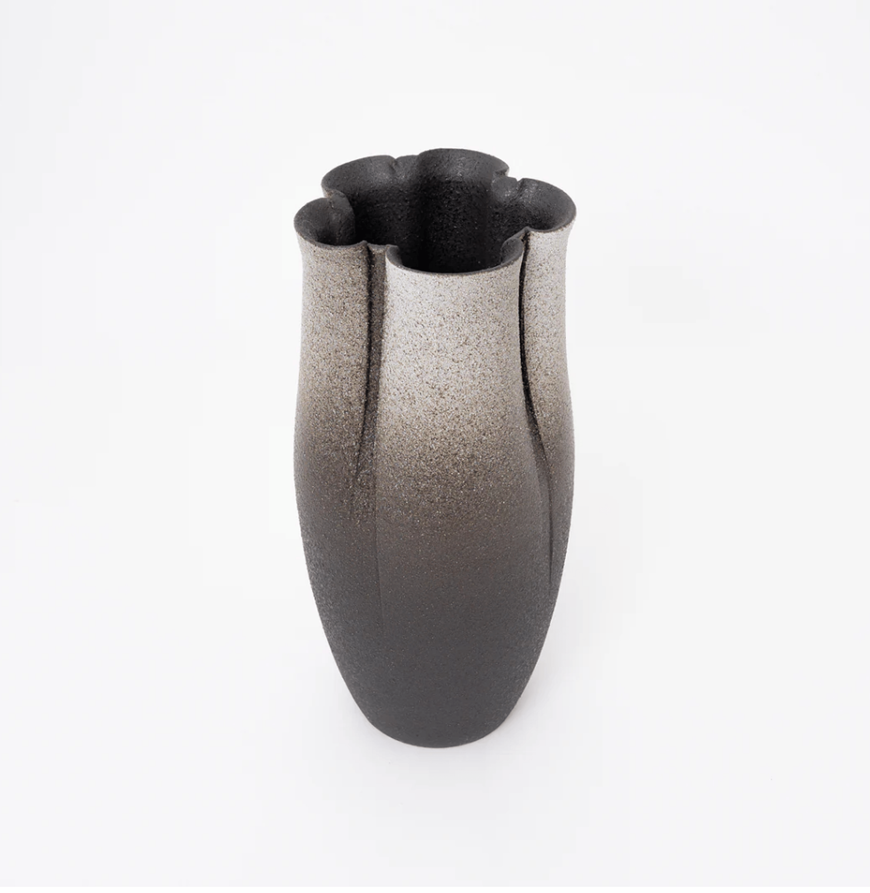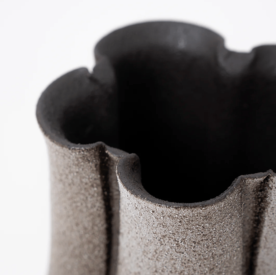 Introducing this exquisitely crafted Shigaraki-yaki handmade vase. Crafted with precision and care, this vase embodies the essence of elegance and tradition. The body of the vase is meticulously formed using black clay, sculpted into the graceful shape of a blooming flower.Adorning the surface with delicate splashes of white, evoking the sensation of falling snow, further enhances its allure.