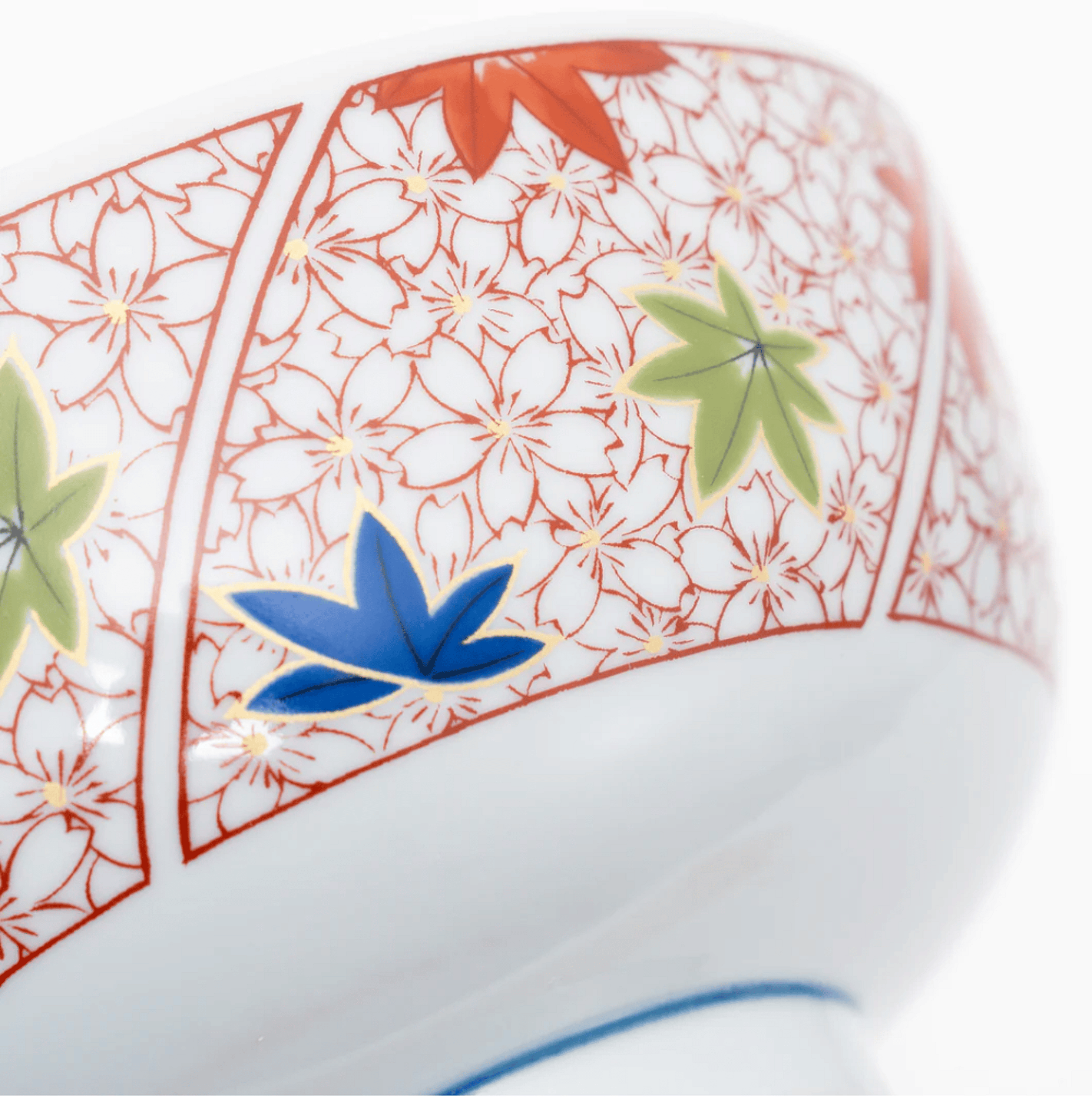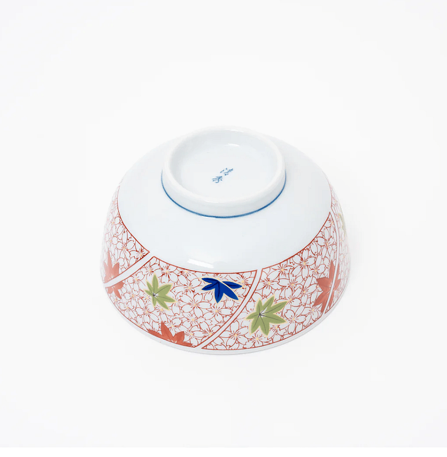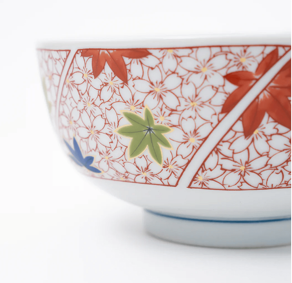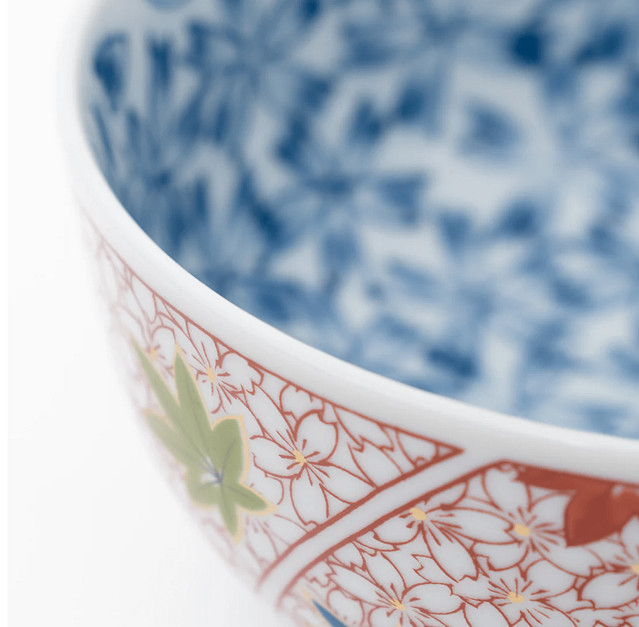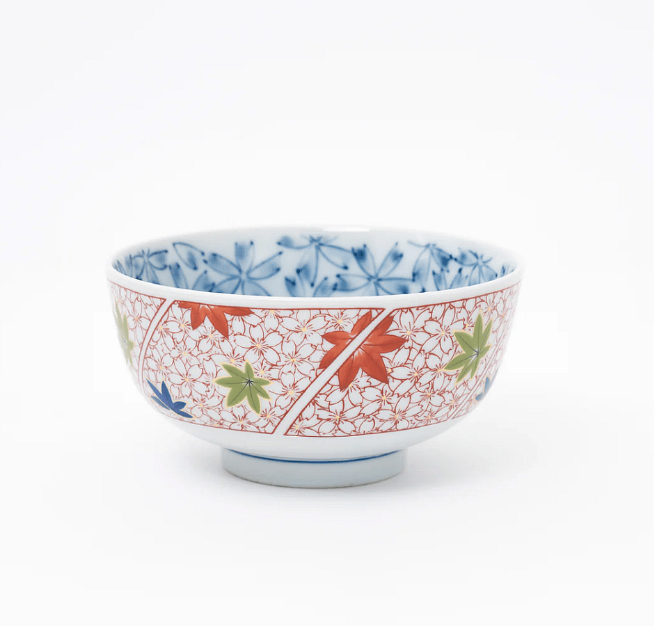 This porcelain donburi bowl features a striking blue cherry blossom pattern on the inner wall, offering a serene and elegant touch to your dining experience. The outer wall showcases a blend of red cherry blossoms and maple leaf designs in red, blue, and green, adding a vibrant and traditional Japanese aesthetic to your table setting.