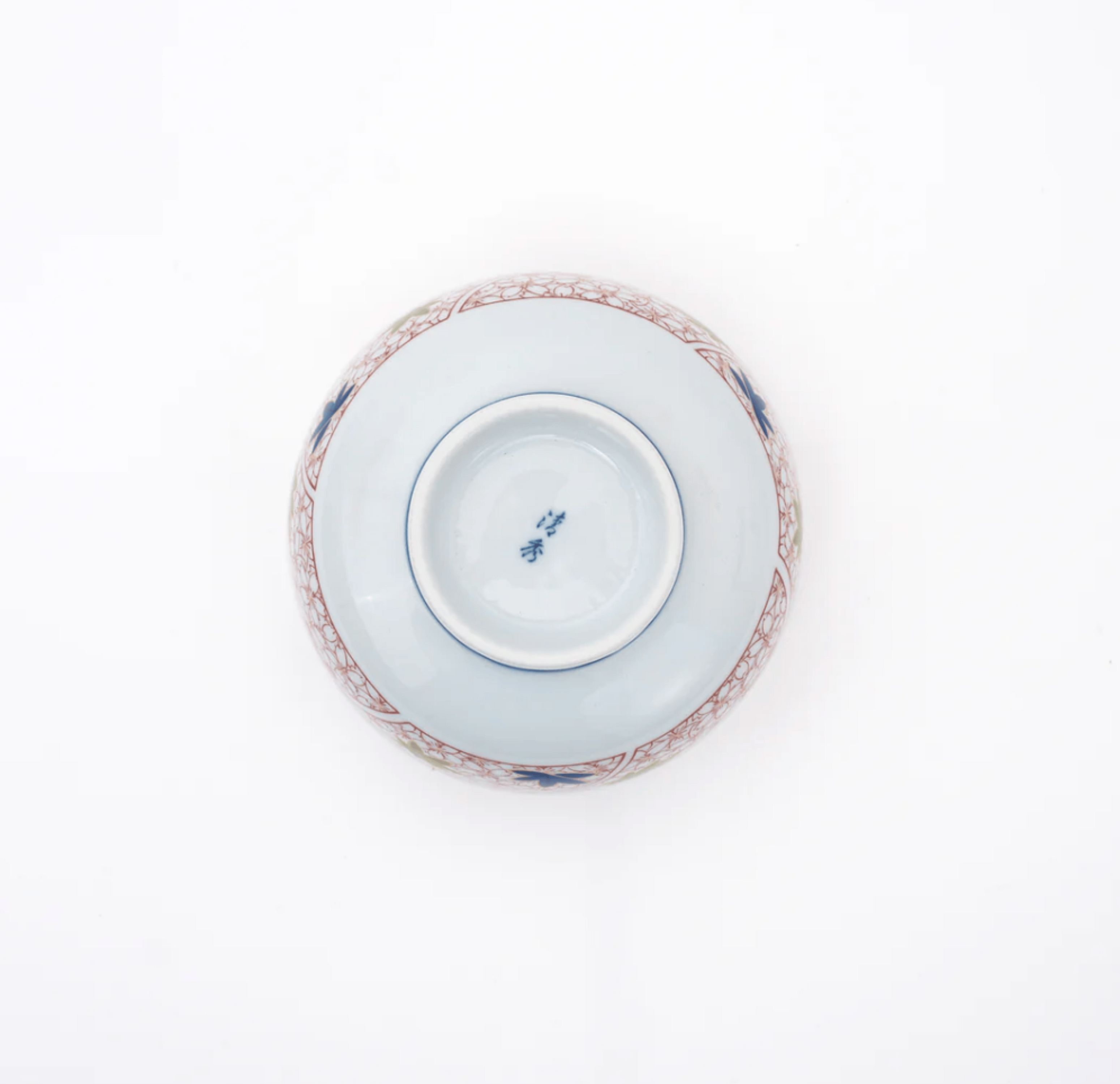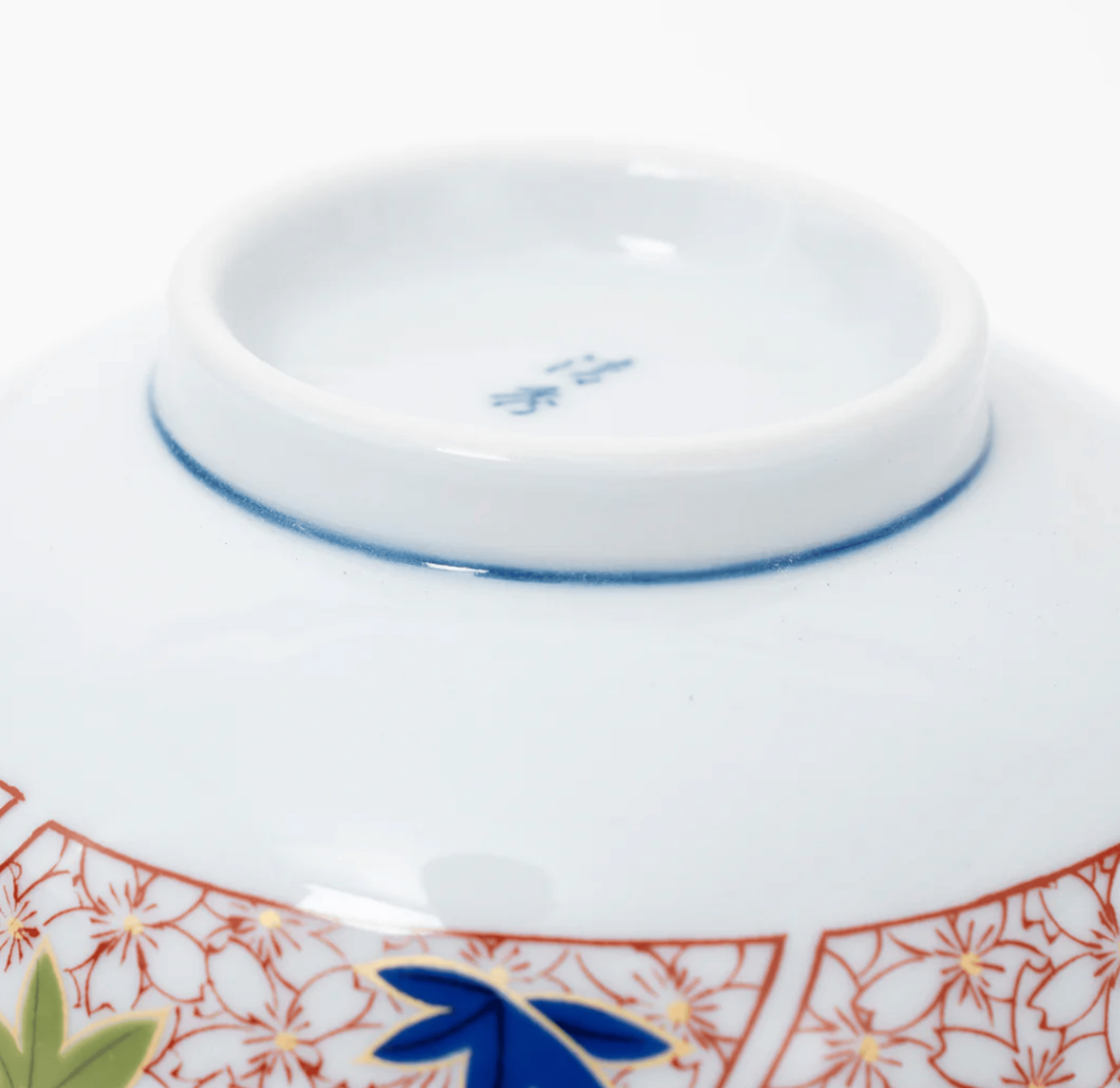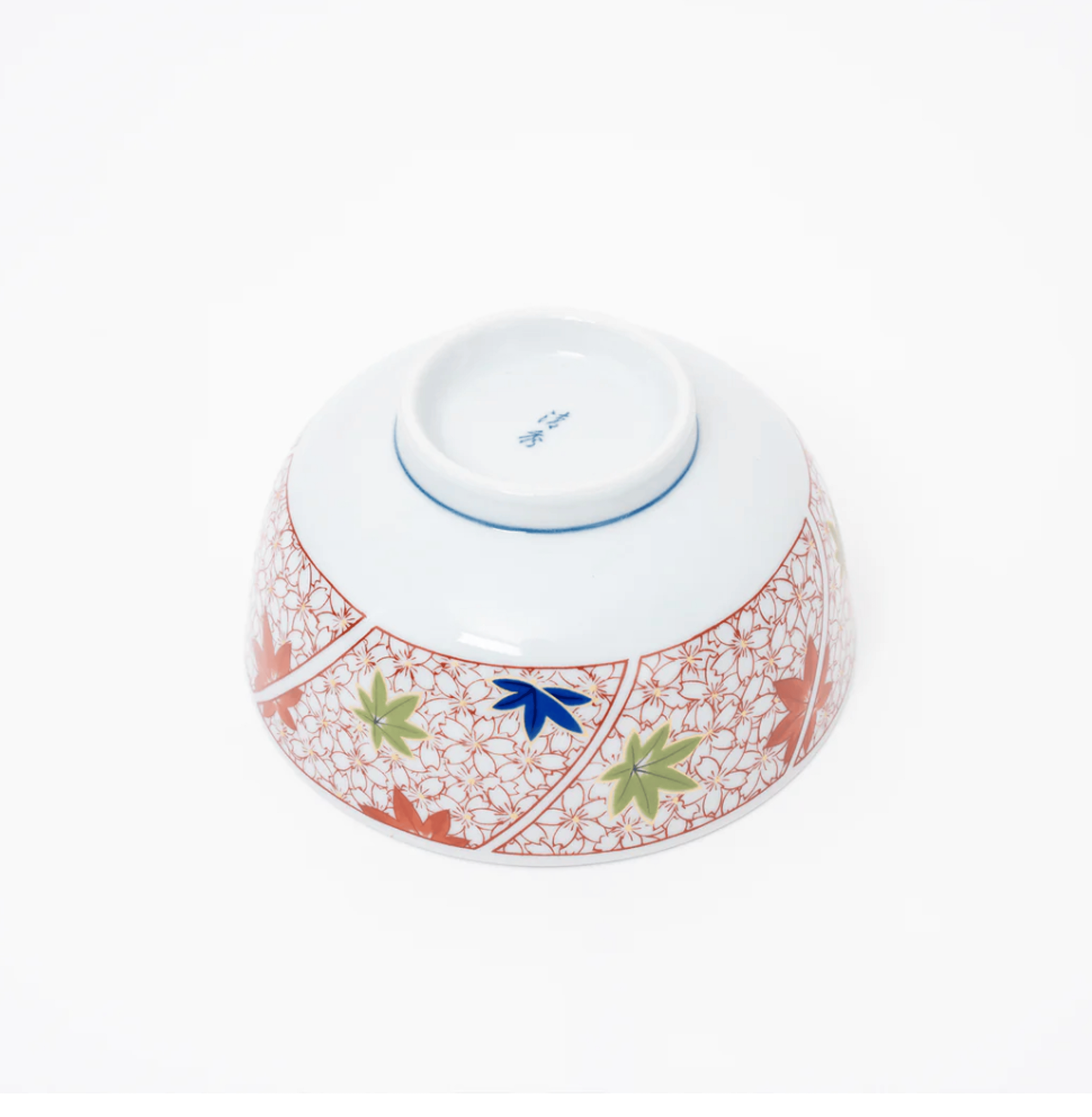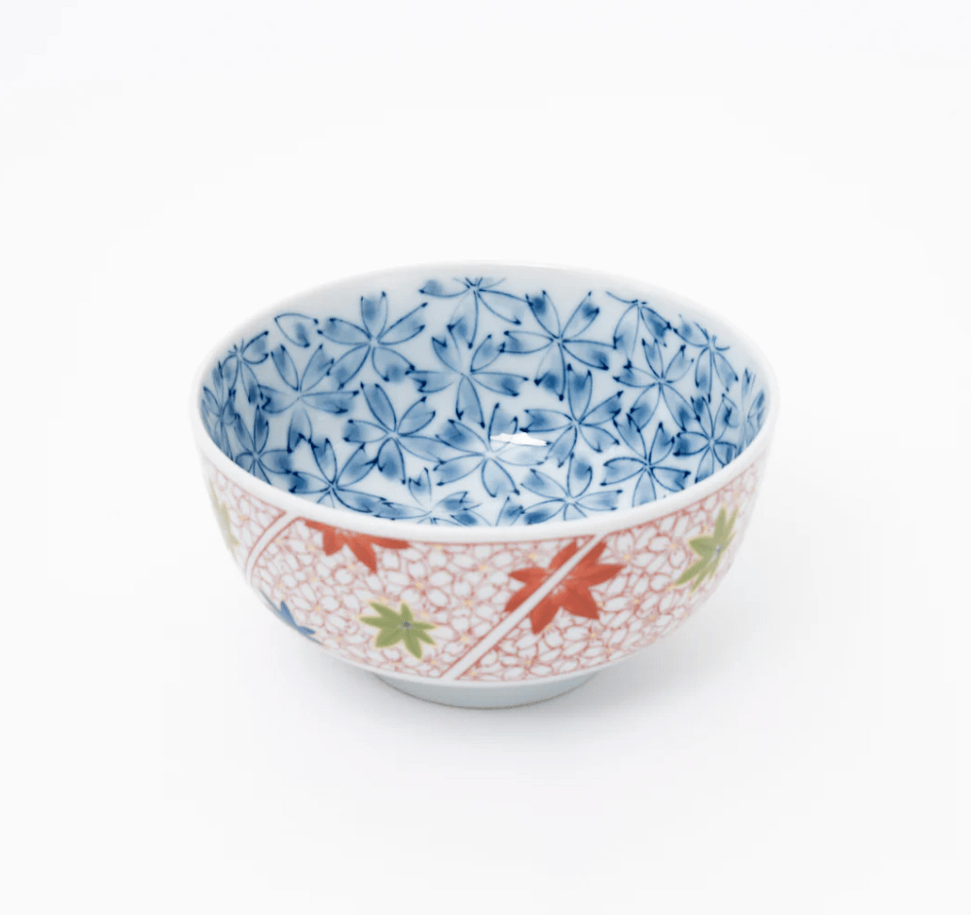 This porcelain donburi bowl features a striking blue cherry blossom pattern on the inner wall, offering a serene and elegant touch to your dining experience. The outer wall showcases a blend of red cherry blossoms and maple leaf designs in red, blue, and green, adding a vibrant and traditional Japanese aesthetic to your table setting.