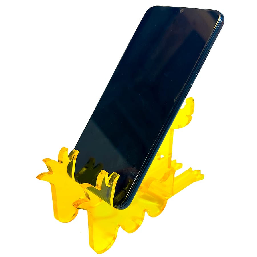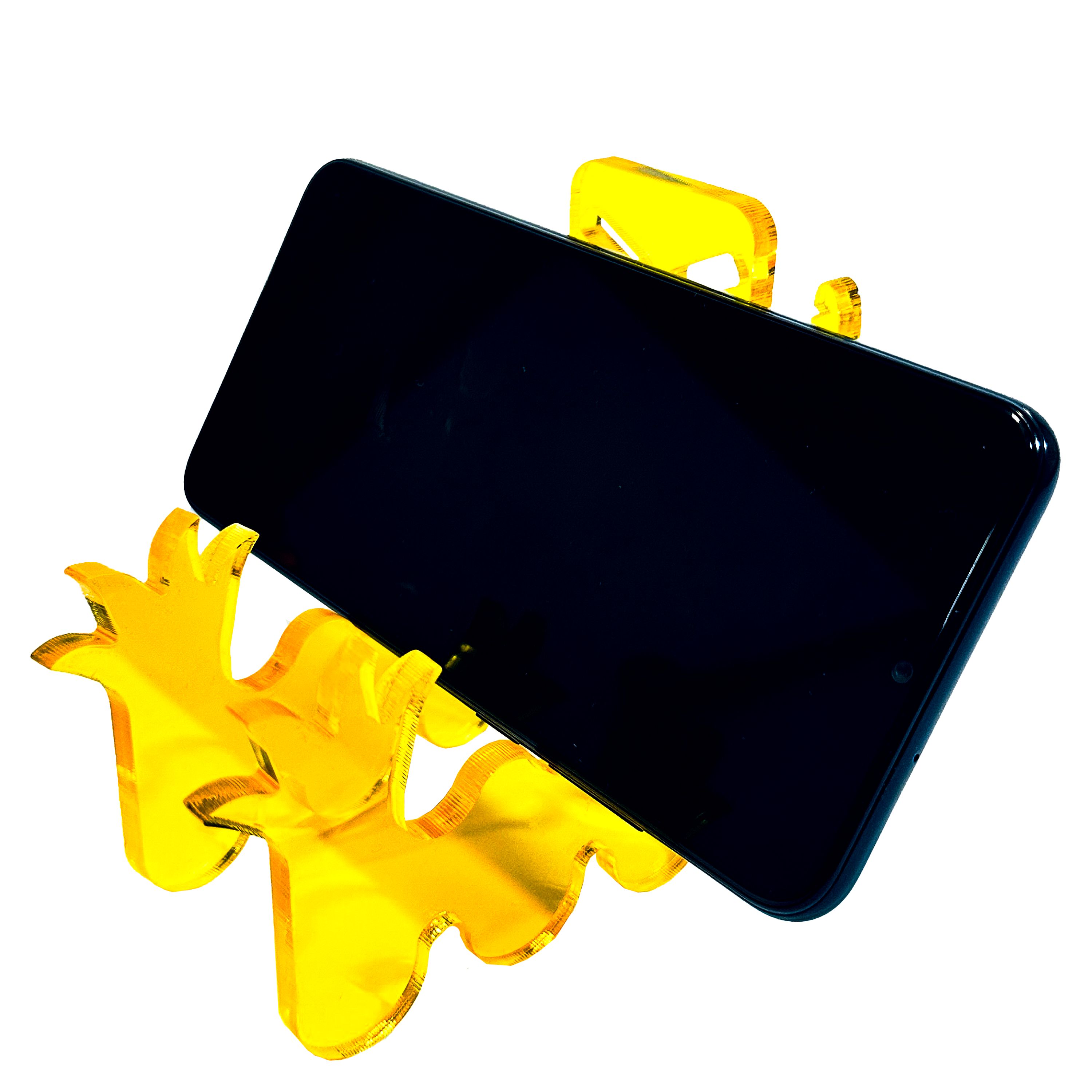 Introducing the "Yucky Yellow Yarvin" Squiggle Arm Phone Stand—a fun and sturdy phone stand with a unique monster design! Made from durable 0.25-inch acrylic, the "Yucky Yellow Yarvin" securely holds your phone at the perfect viewing angle. Its squiggly arms add a playful touch while keeping your device stable.