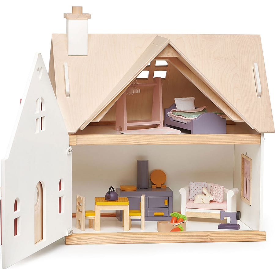The **Tender Leaf Toys Cottontail Cottage** is a charming, wooden dollhouse designed to inspire imaginative play and storytelling. This beautifully crafted **two-story country cottage** features a classic, cozy design with an opening front panel, cut-out windows, and a delightful bunny-themed aesthetic.