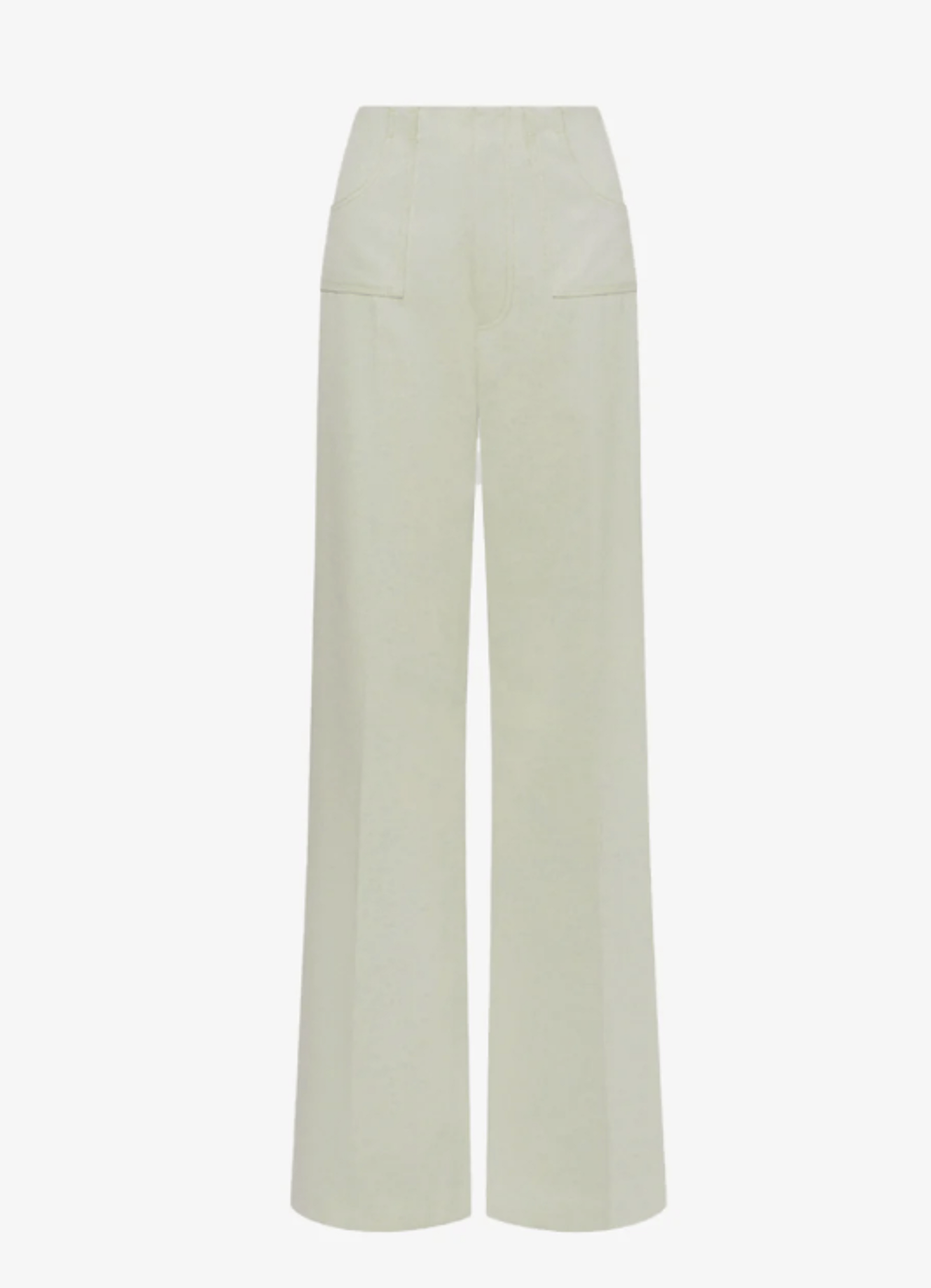High-waisted trousers in diagonal canvas with visible stitching in a hunter green. The silhouette opens with a slight flare at the bottom, reminiscent of the silhouette flared trousers of the 1970s.