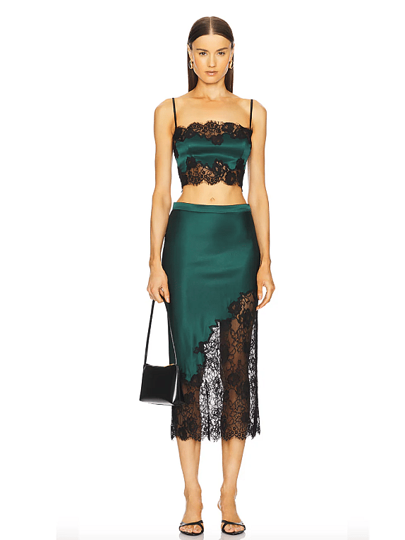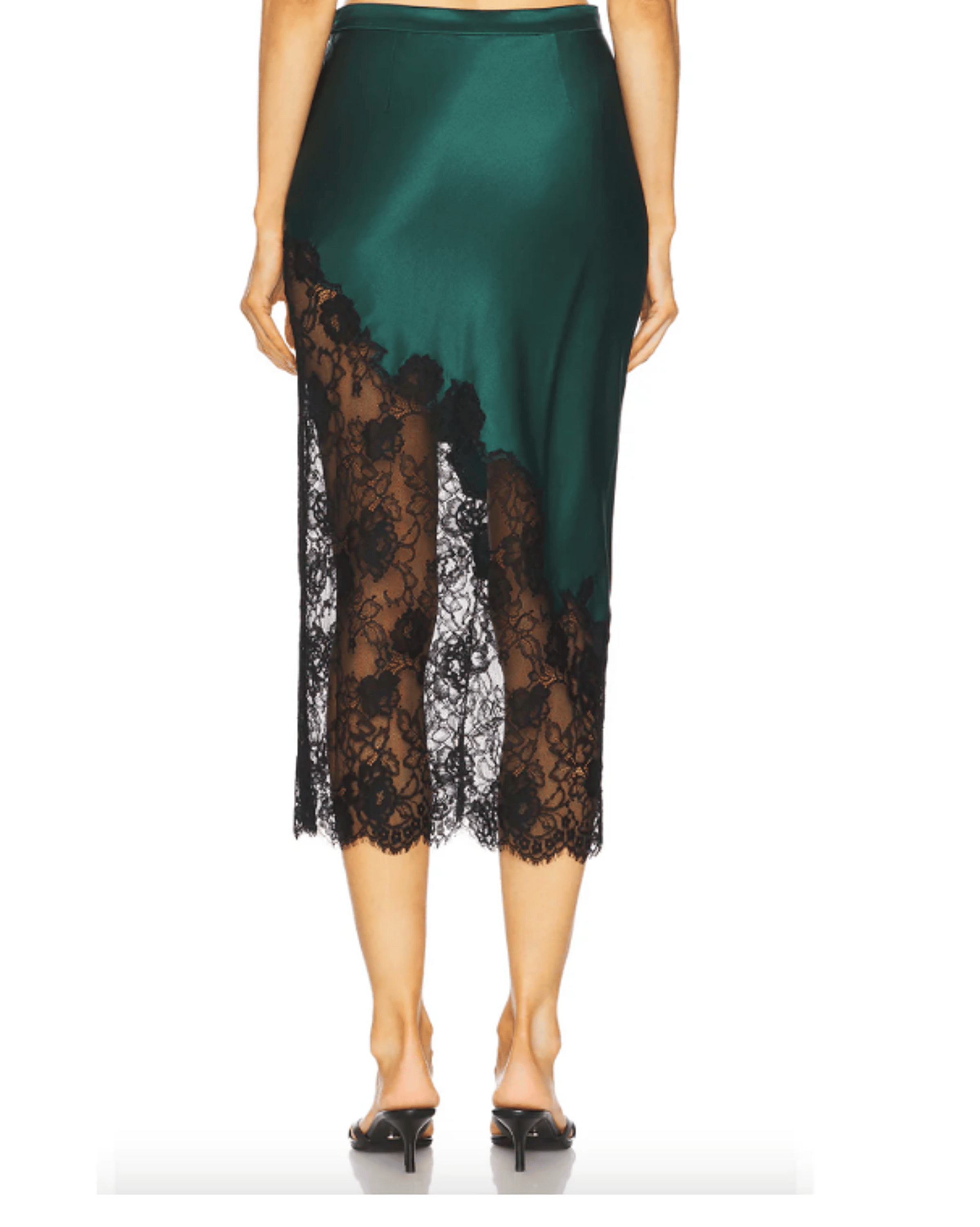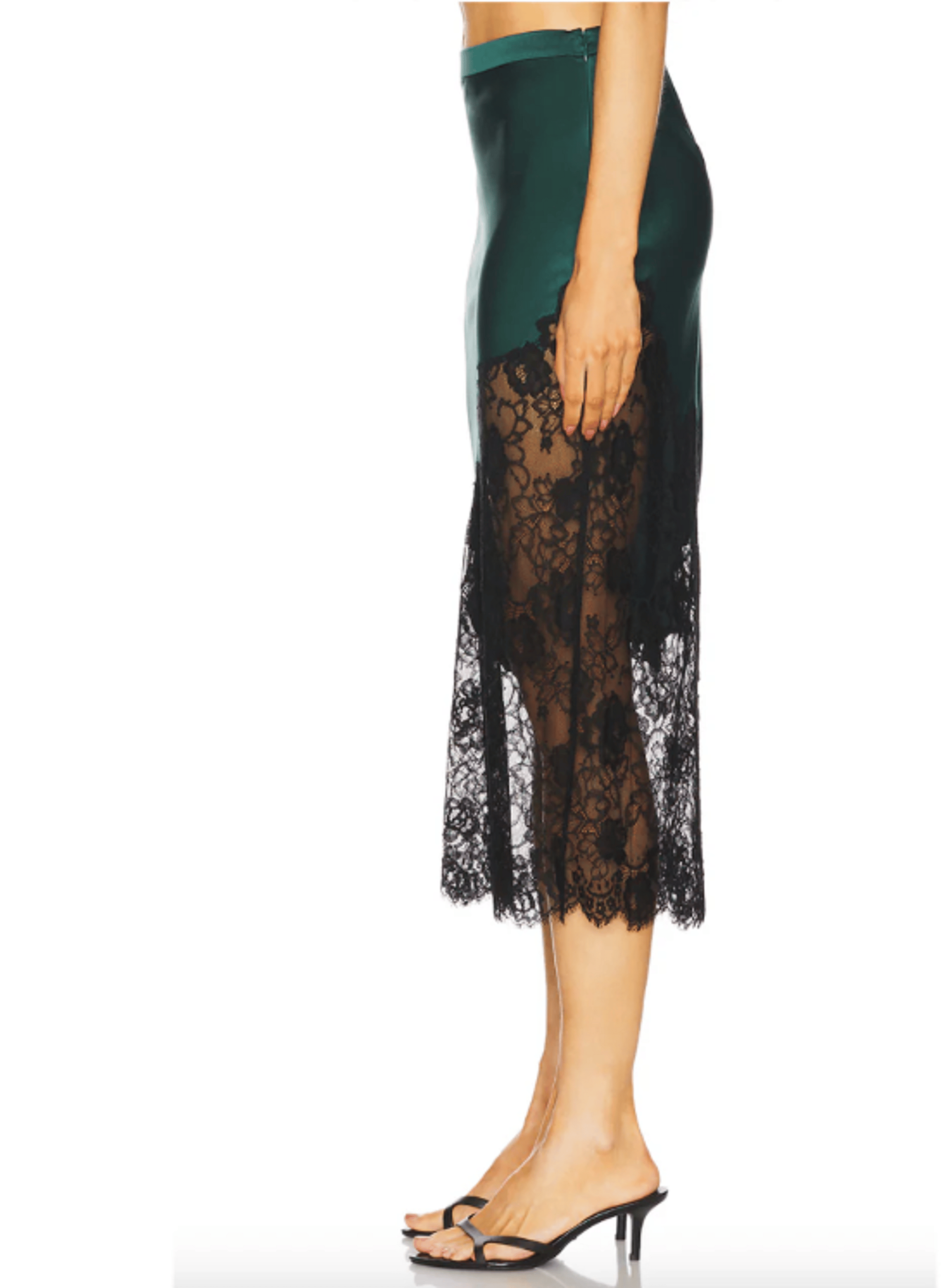 Show a little leg. Bring the heat in our Silk & Chantilly Lace Skirt, cut from luxe silk charmeuse with chantilly lace panel to give a peek at what's underneath. Invisible zip closure, midi length. Pair with the Georgette Cold Shoulder Top for a chic monochromatic look.