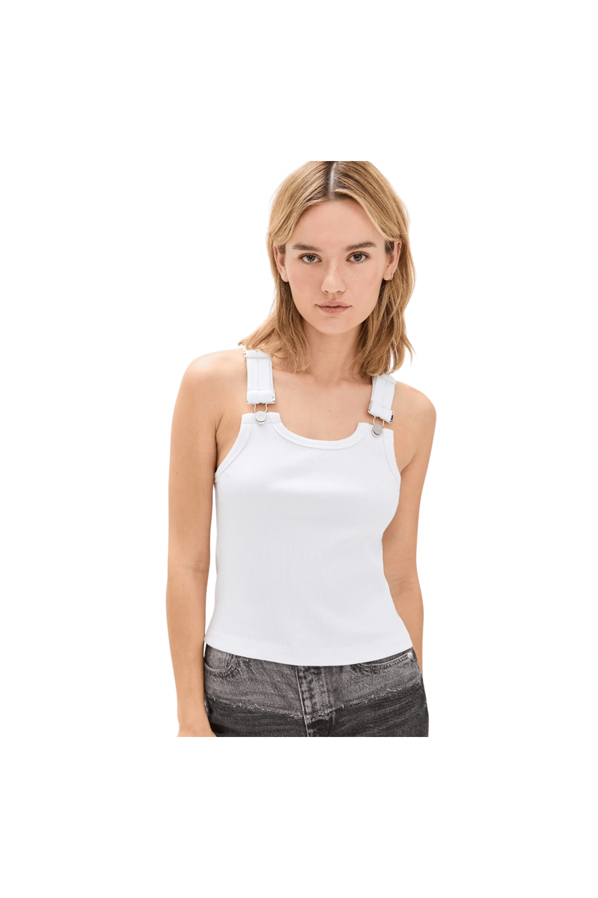 The Mississippi Tank is an overall-inspired classic tank top. It features thick ribbed cotton and adjustable clasp loop buckles