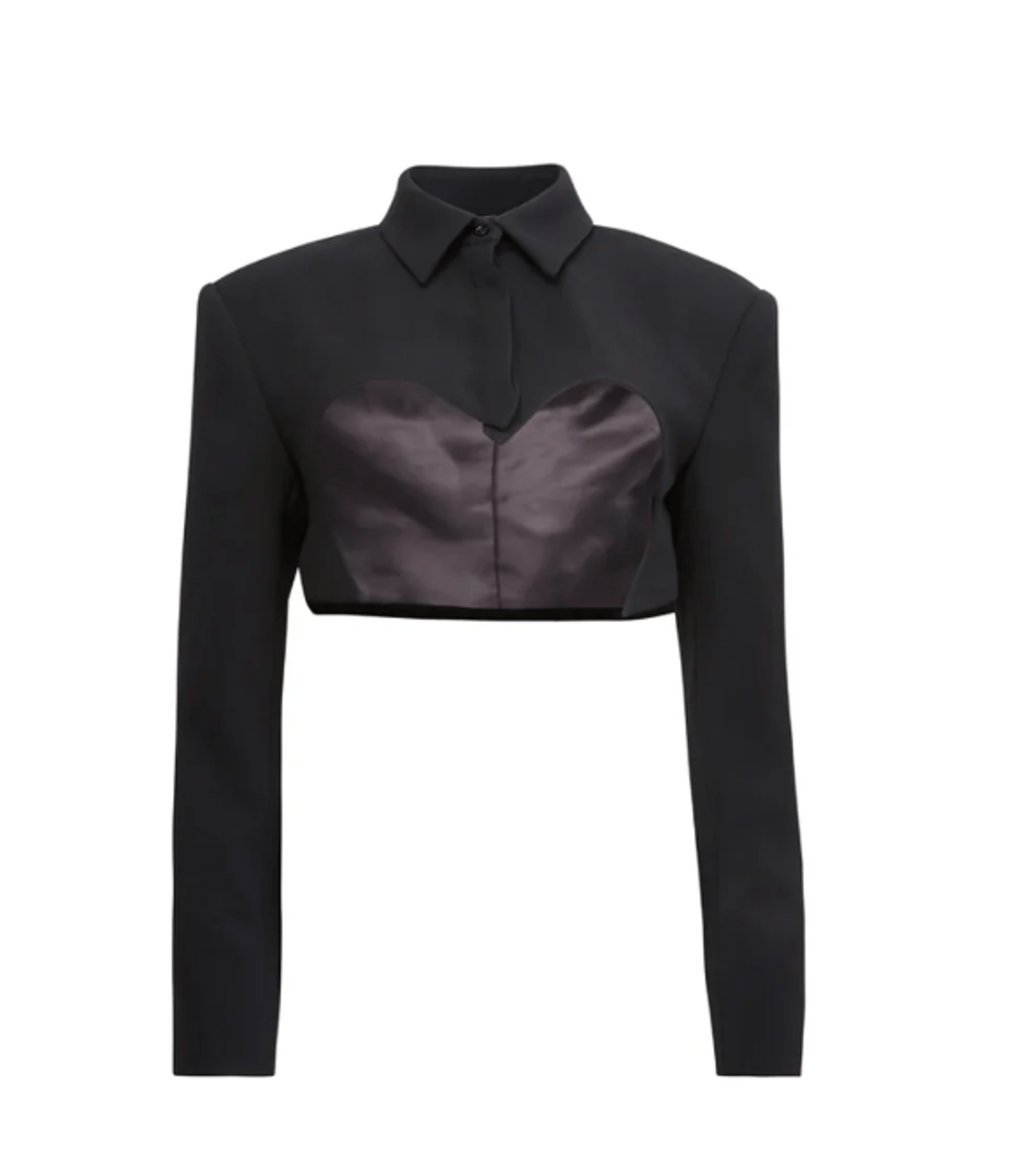 Our Cropped Blazer, with cutout heart-shaped front that sits above the chest. Back and side seam lands at the waist. Lined. Looks chic with the Charlotte Balconette Bodysuit.