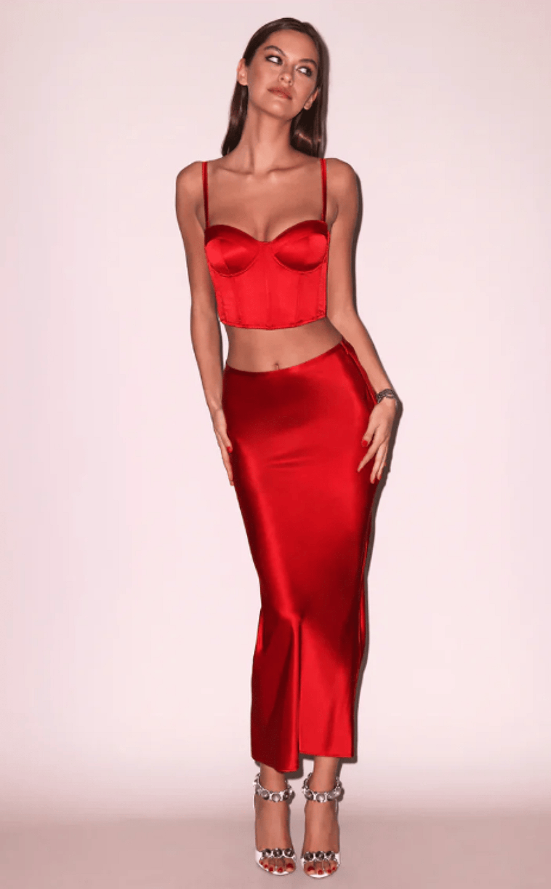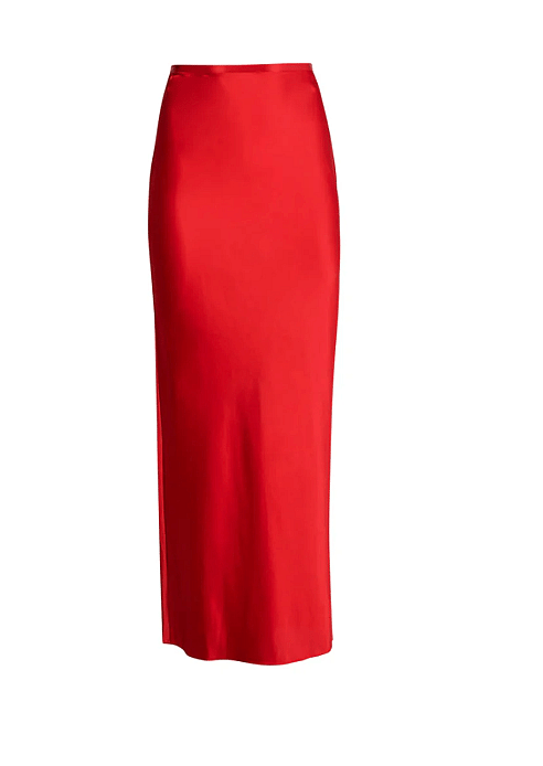 Our Silk Bias Cutout Skirt, cut from luxe bias cut silk charmeuse with back cutout detail. Back slit, invisible side zip closure. Looks chic paired with the matching Cropped Hamptons Bustier or the Knit Ribbed Cardigan #Girlsnightout