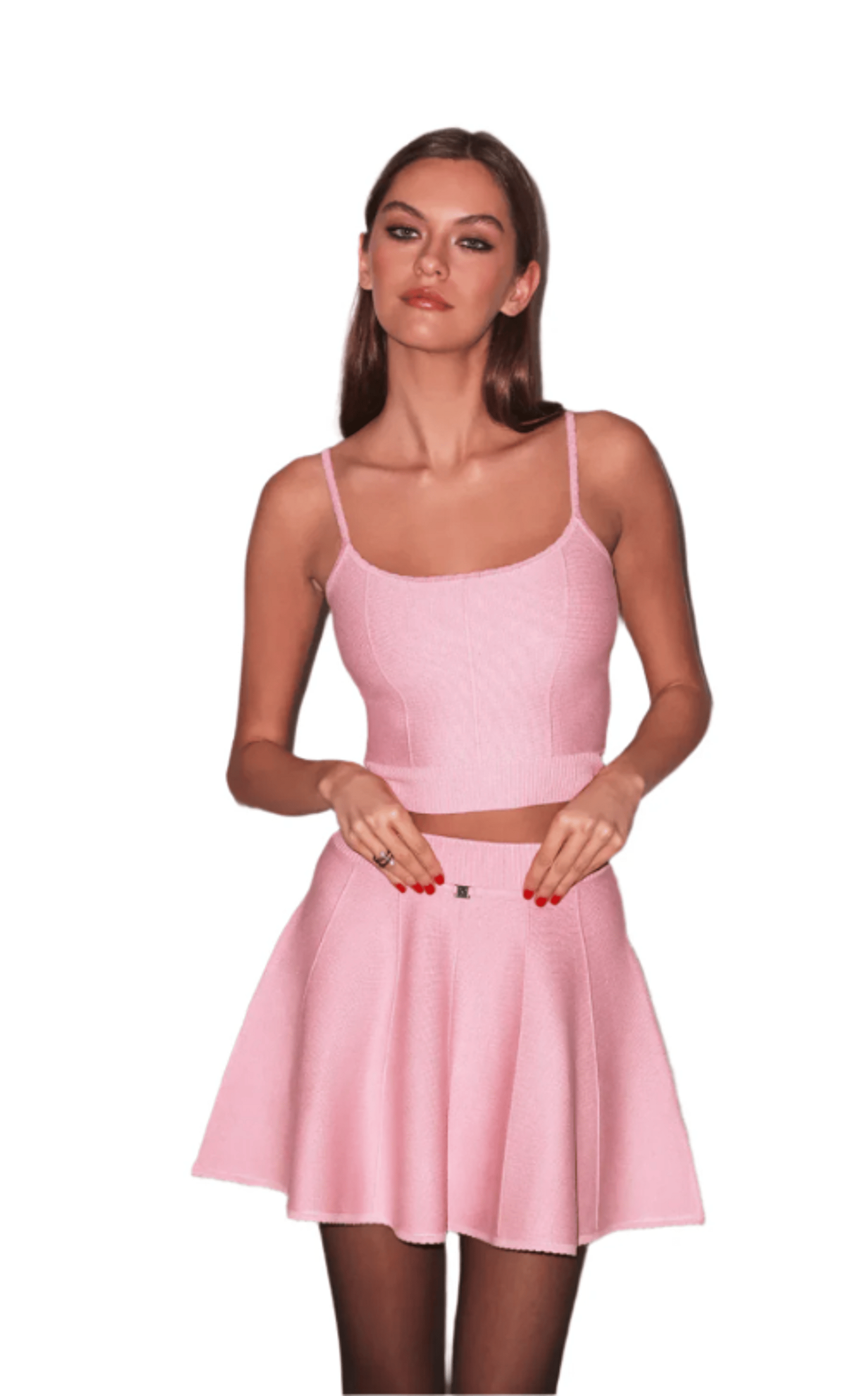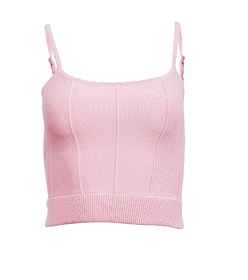 Get it right, get it tight. Our Knit Corset Top, cut from soft stretch jacquard with corset seaming and boning to flatter your figure. Features picot trim at straps and neckline and wide rib bottom. Adjustable straps. Take it out with the matching Knit Flare Mini Skirt & Knit Zip Bustier Cardigan.