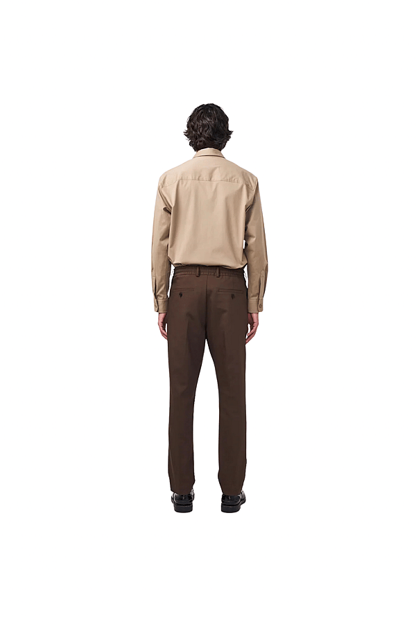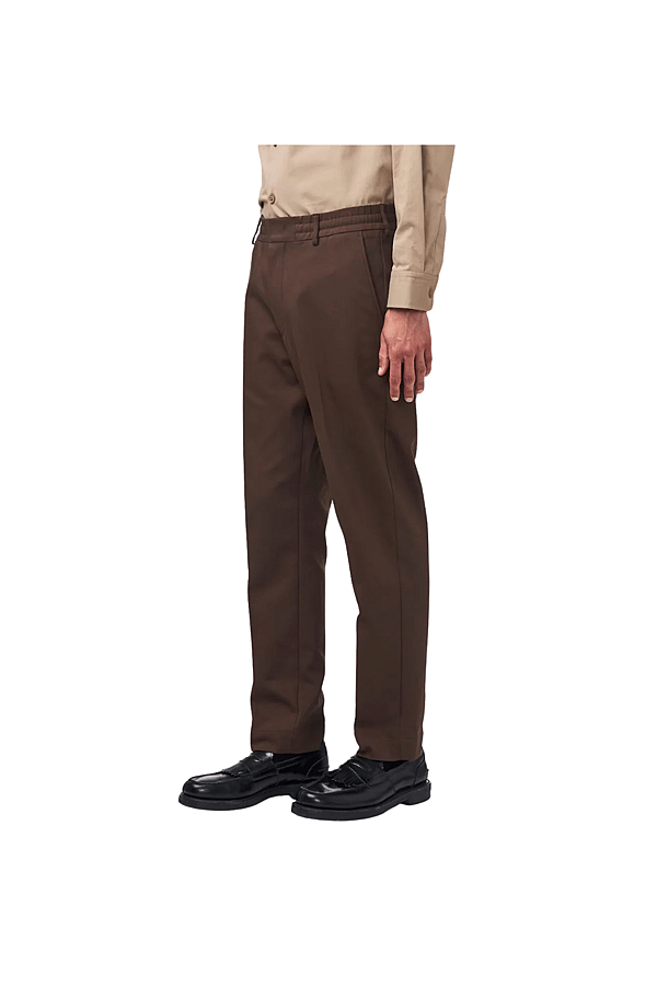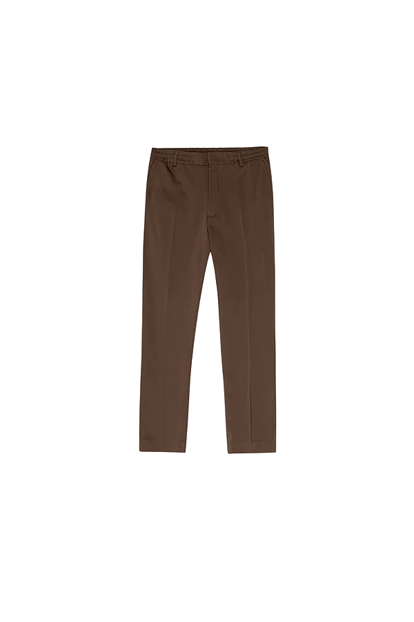A pair of regular fit dress trousers with a tapered leg, crafted from a 260 g/m2 cotton blend of double-faced fabric. The trousers have a drawstring closure, an elasticated waistband, and are finished with a press fold and zip fly.