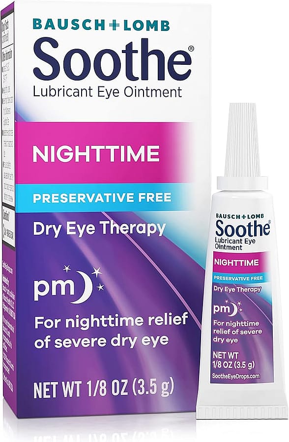 Dry eyes keeping you from catching any Zzzs? Try Bausch + Lomb's Soothe Lubricant Eye Ointment ? Nighttime. Formulated with dynamic lubricants mineral oil and white petrolatum, this unique ointment is built to help soothe dry eyes and guard against further irritation. Simply pull down the lower lid of the affected eye and apply the suggested amount to the inside of the eyelid before going to bed.