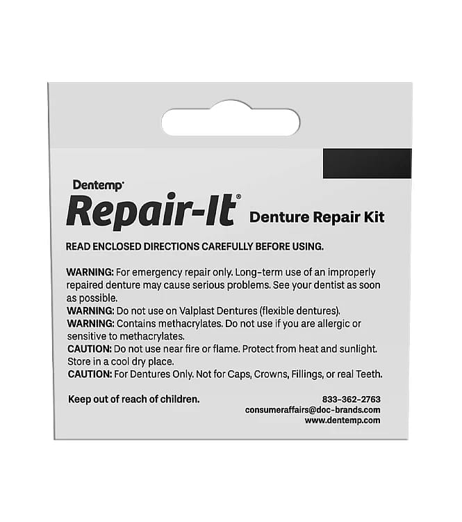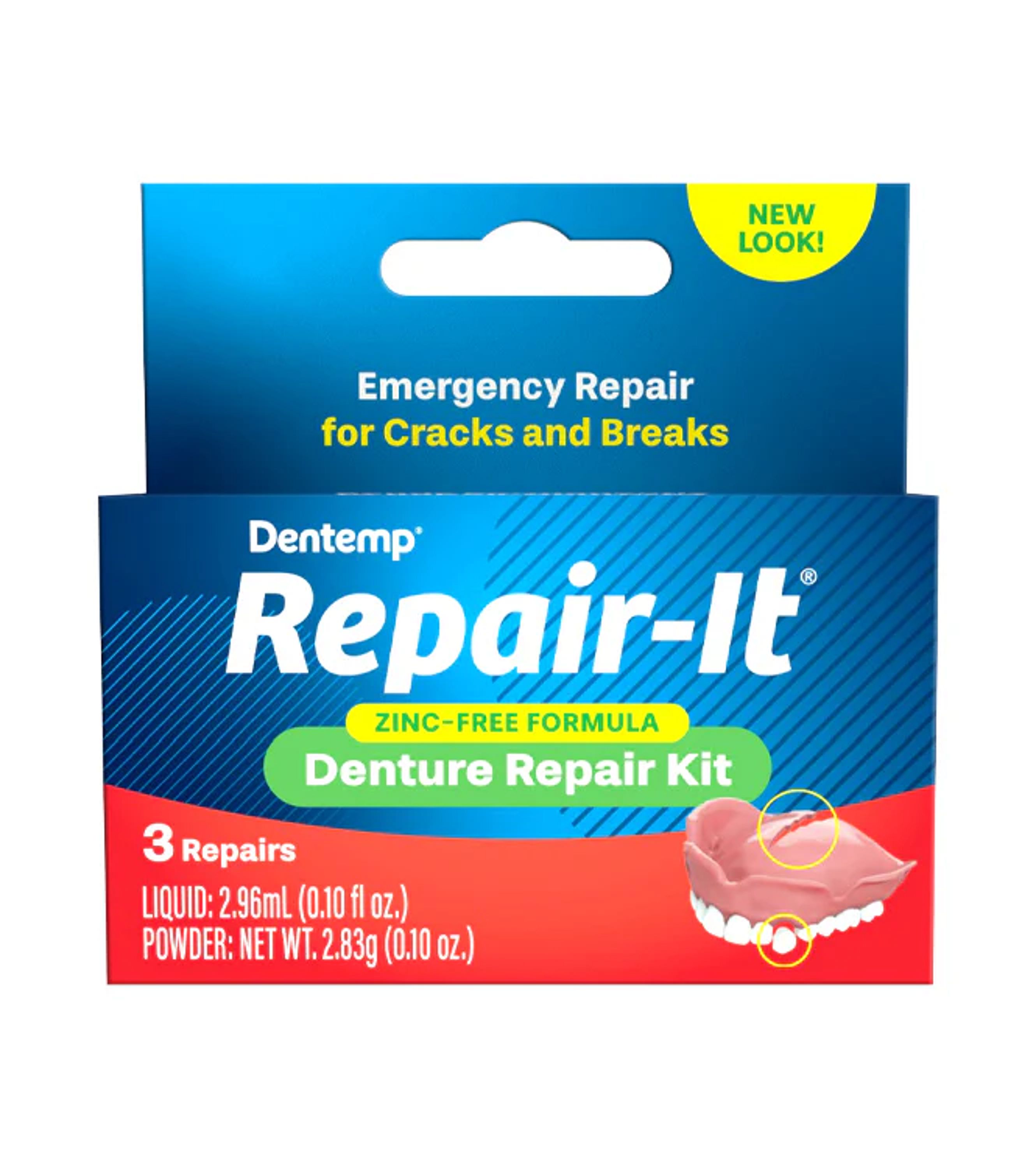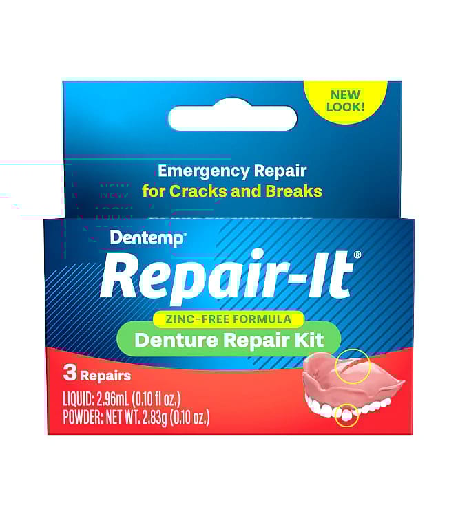 Repair Broken Dentures Quickly and Inexpensively! The Dentemp Repair-It Denture Repair Kit contains everything you need to fix breaks, mend cracks and replace loose teeth in minutes. The safe and easy-to-use kit is zinc-free and a must-have for anyone with dentures.